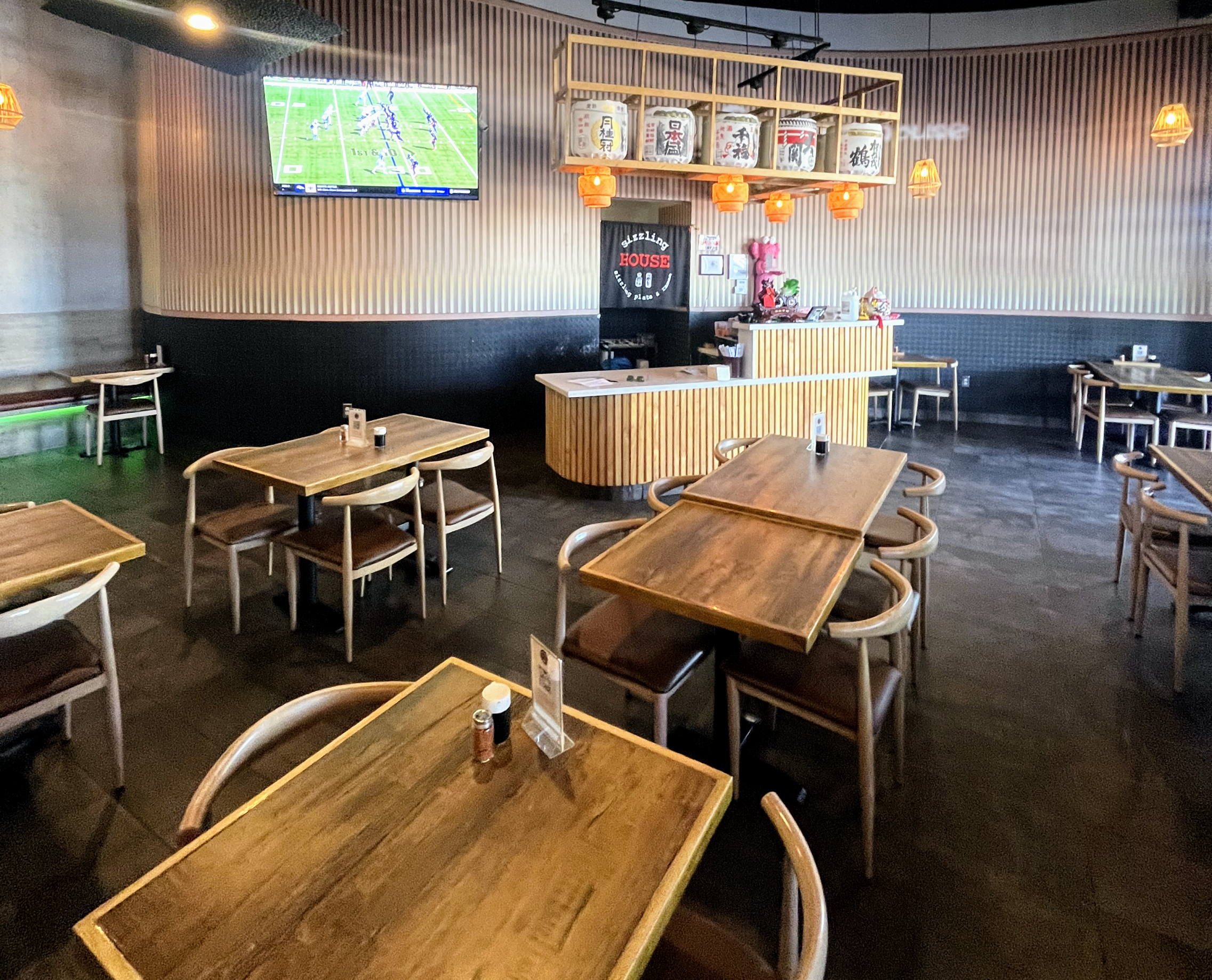 On our visit, a server handed off a sizzling rice platter with shrimp and another with salmon, both served with corn, edamame, garlic butter and green onions. Each $16.99 platter is protected by a cardboard sleeve reading “mix to enjoy,” which helps prevent spills and keeps diners from getting singed. Customers can choose between rice or noodles for their sizzling dishes.