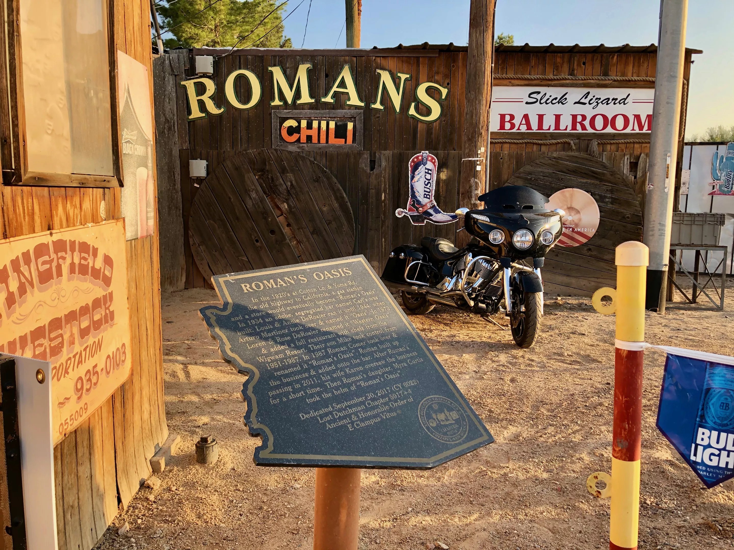 A plaque outside of Roman’s Oasis gives the history of the bar and the Derosier Ranch.