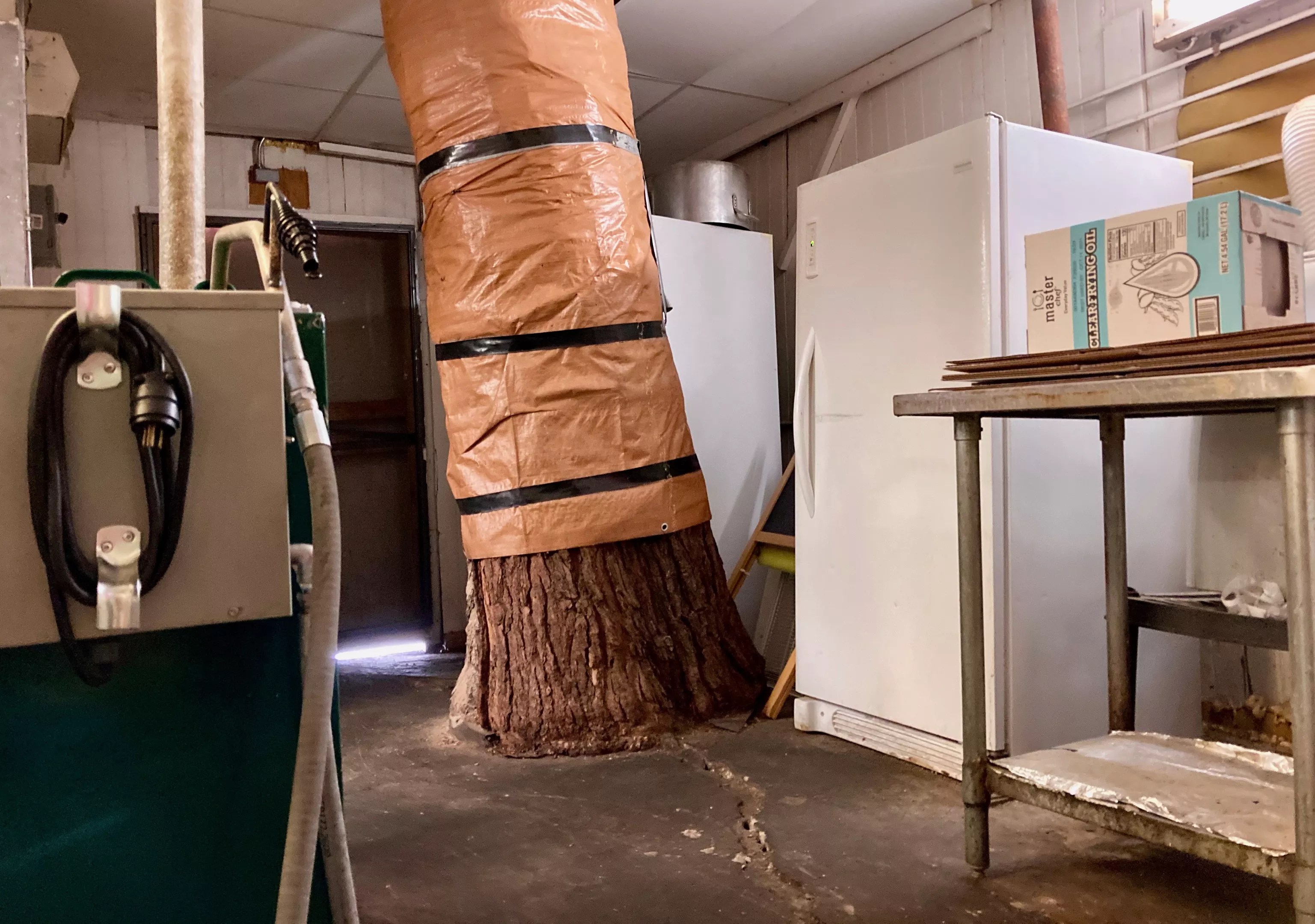 It’s a pine tree, planted in the 1920s, and the trunk (heavily wrapped, to prevent “critters” from getting into the kitchen) is about 40 inches around.
