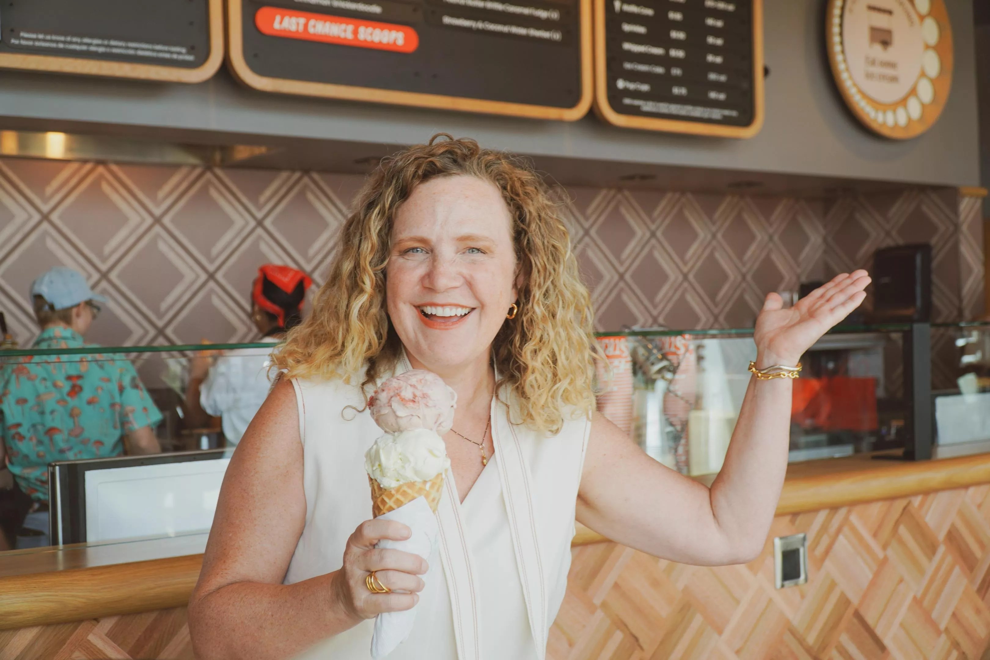 Salt & Straw co-founder Kim Malek poses with her go-to ice cream order: a double-scoop waffle cone with Arbequina Olive Oil and Strawberry Honey Balsamic with Black Pepper ice cream.