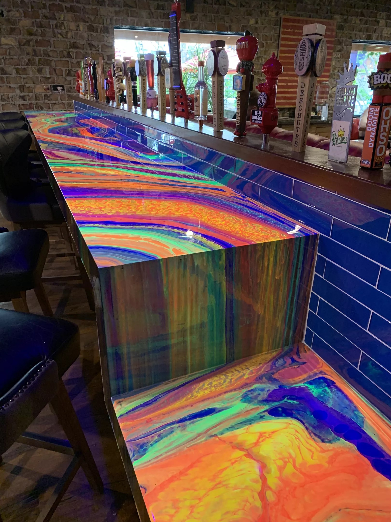 Schmooze drinkers can find ultimate Instagram backdrops for their cocktails on bar tops made by Leila Parnian. The artist used a “pour art” technique that involves mixing black-light friendly paint and chemicals and then pouring the mixture without the help of paint brushes.