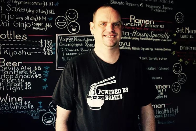 The ramen ronin: Brian Webb stands before Hot Noodles’ hand-written menu.