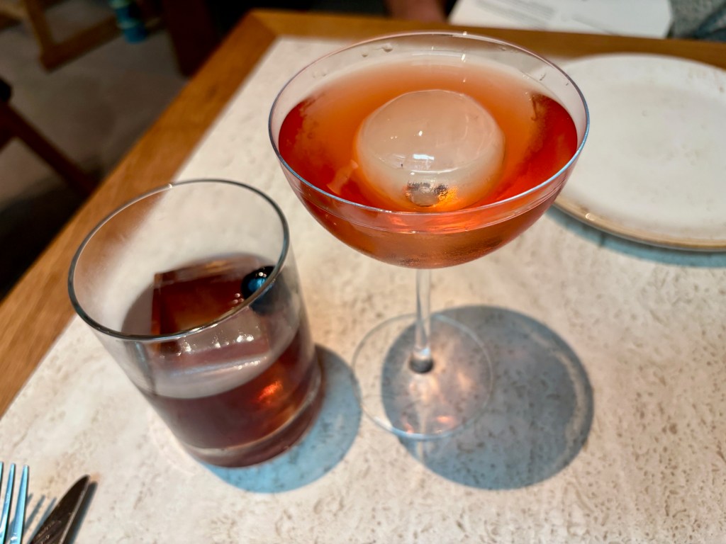 The red-tinted, clarified milk punch of the Red Velvet comes in a thin-stemmed coupe glass with a crystal-clear orb of ice. The tipple is sweet yet balanced, with a creamy, velvety texture. It starts with plum-infused rye mixed with cherry liqueur, red vermouth, almond and lemon, finished with a spritz of cherry mist sprayed at the table.