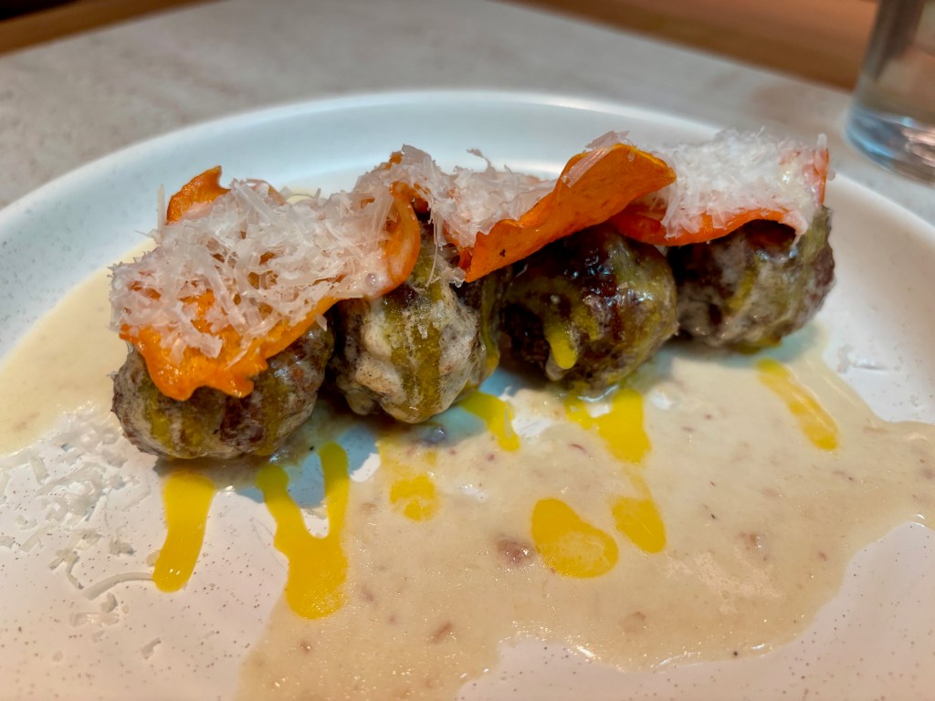 The best bite we tried was the Spanish albondigas. These dense meatballs have very little filler, and are packed with rich, umami flavor. The meatballs are served atop a creamy ham carbonara sauce and topped with a slice of sweet potato and shavings of manchego cheese.