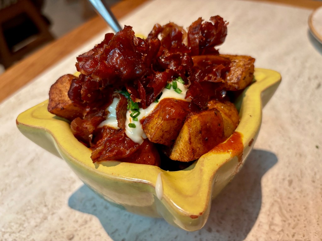 The patatas bravas come with the option to order them “Beast mode,” which our server eagerly recommends. The plus-up means the crisp chunks of potato are topped with crumbled pieces of the iconic Spanish ham.