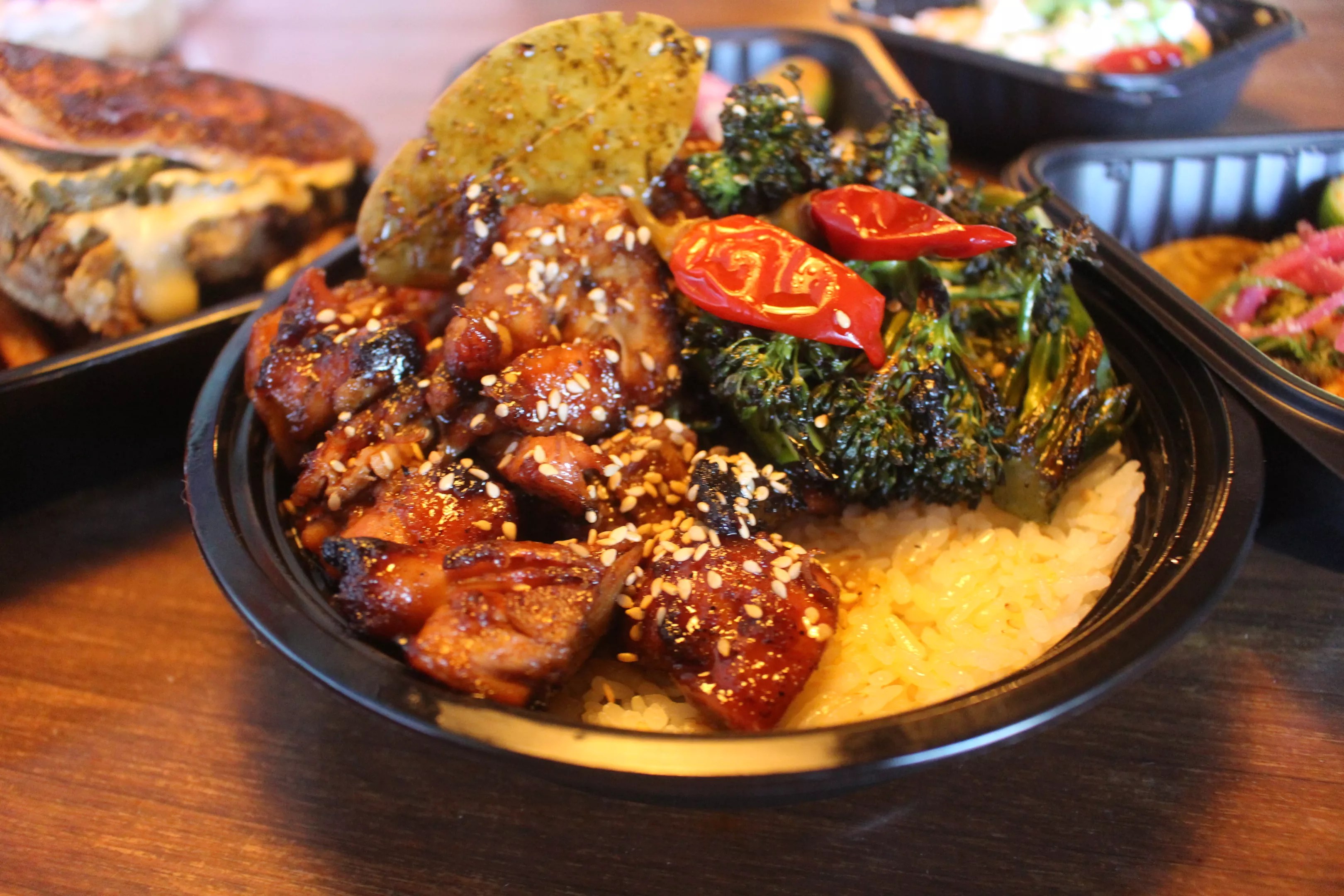 The Adobo Chicken Rice Bowl is a Filipino-inspired rice dish, and Felix describes it jovially, “as if Adobo and Teriyaki had a baby.” The heat comes from Calabrian chile, a chile from Southern Italy, which has a tangy, spicy flavor.