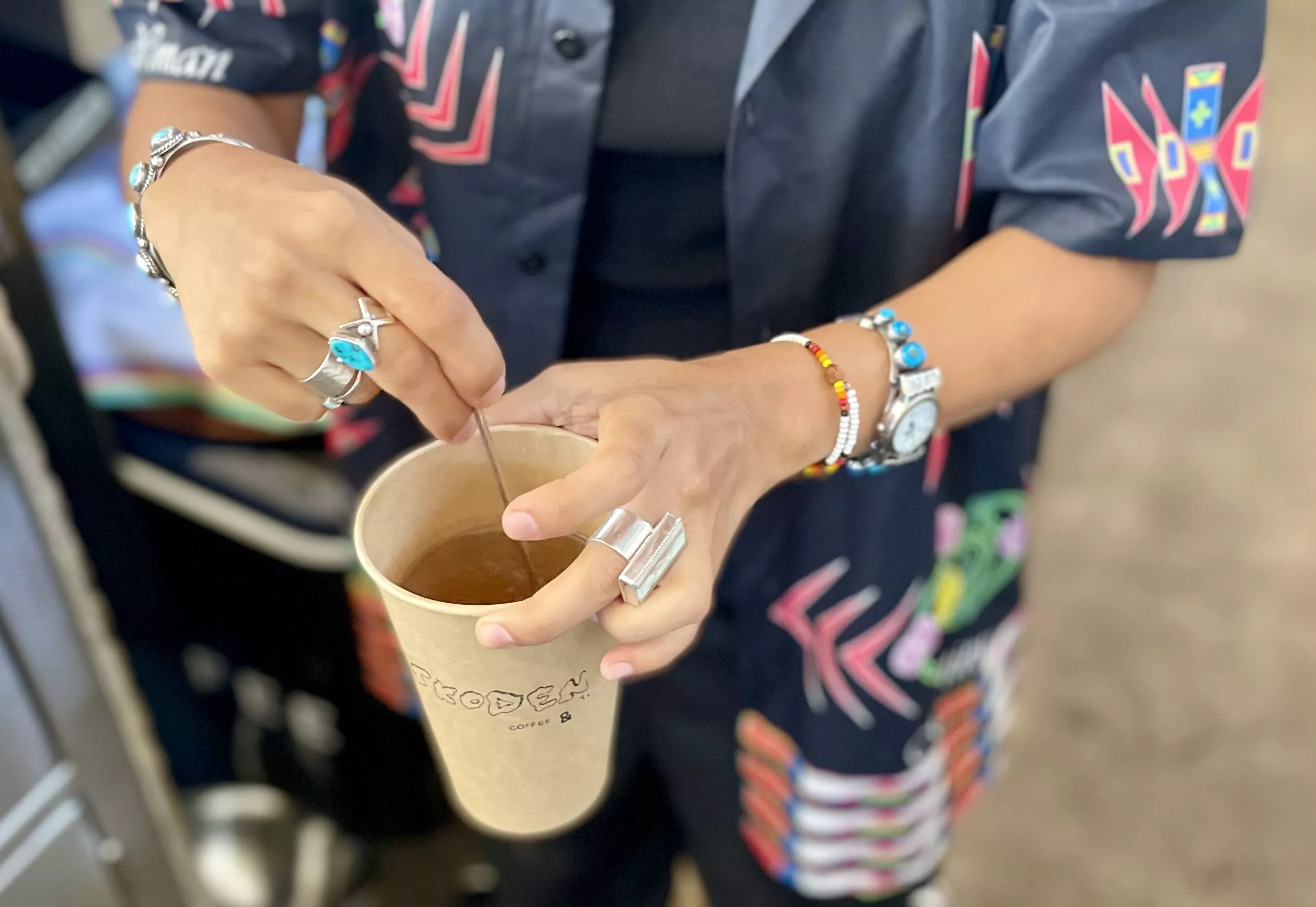 Skoden co-owner Natasha John stirs a paper cup of Diné tea, which was harvested outside of Gallup, New Mexico.