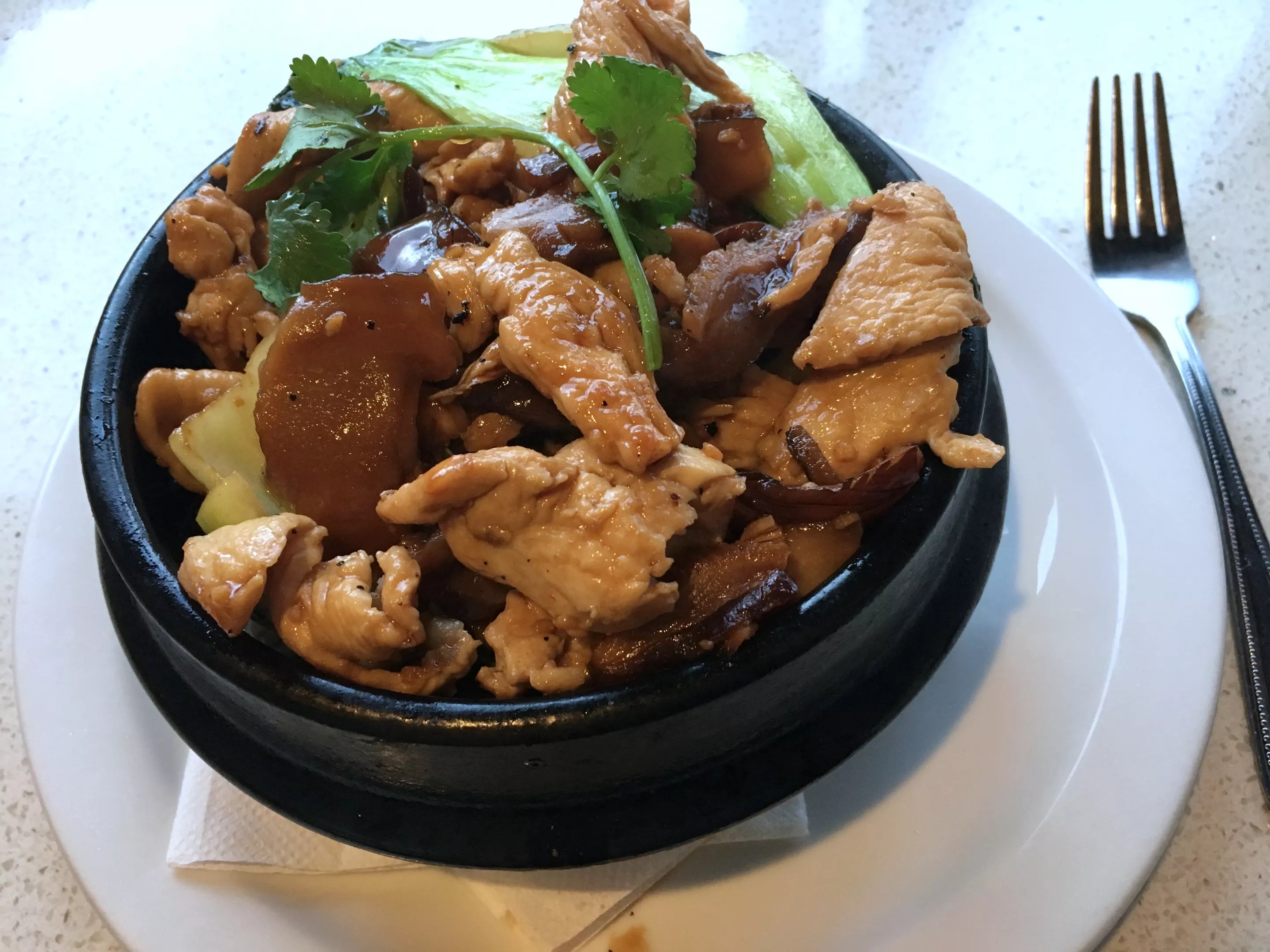 Not too long after, I hear the next triple-D dish coming. It’s a molten clay pot hissing like reptile, blazing my way thanks to a waitress and a long stay over the blue flame of a stove.