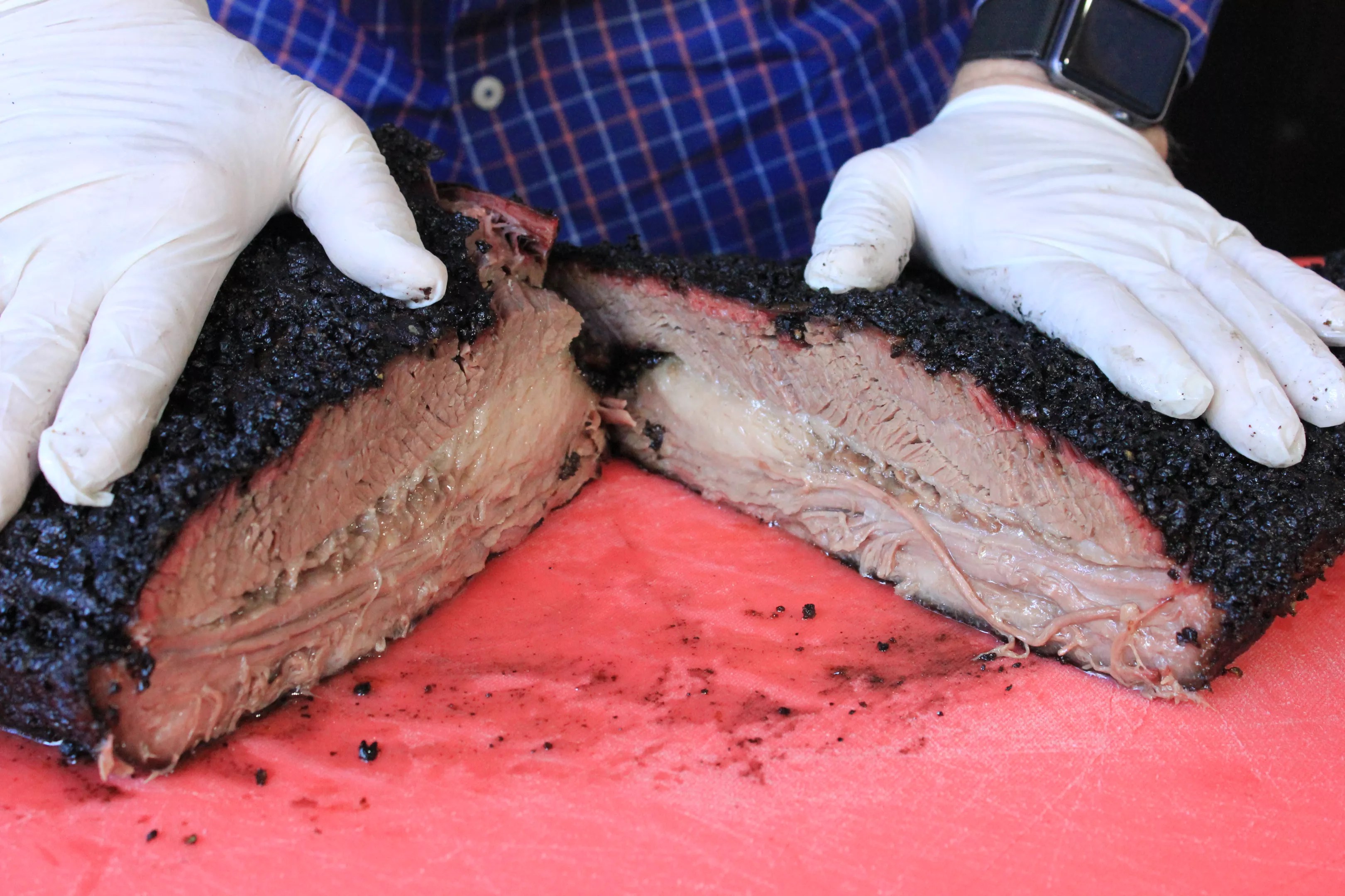 Brisket sliced into its two halves: flap and point