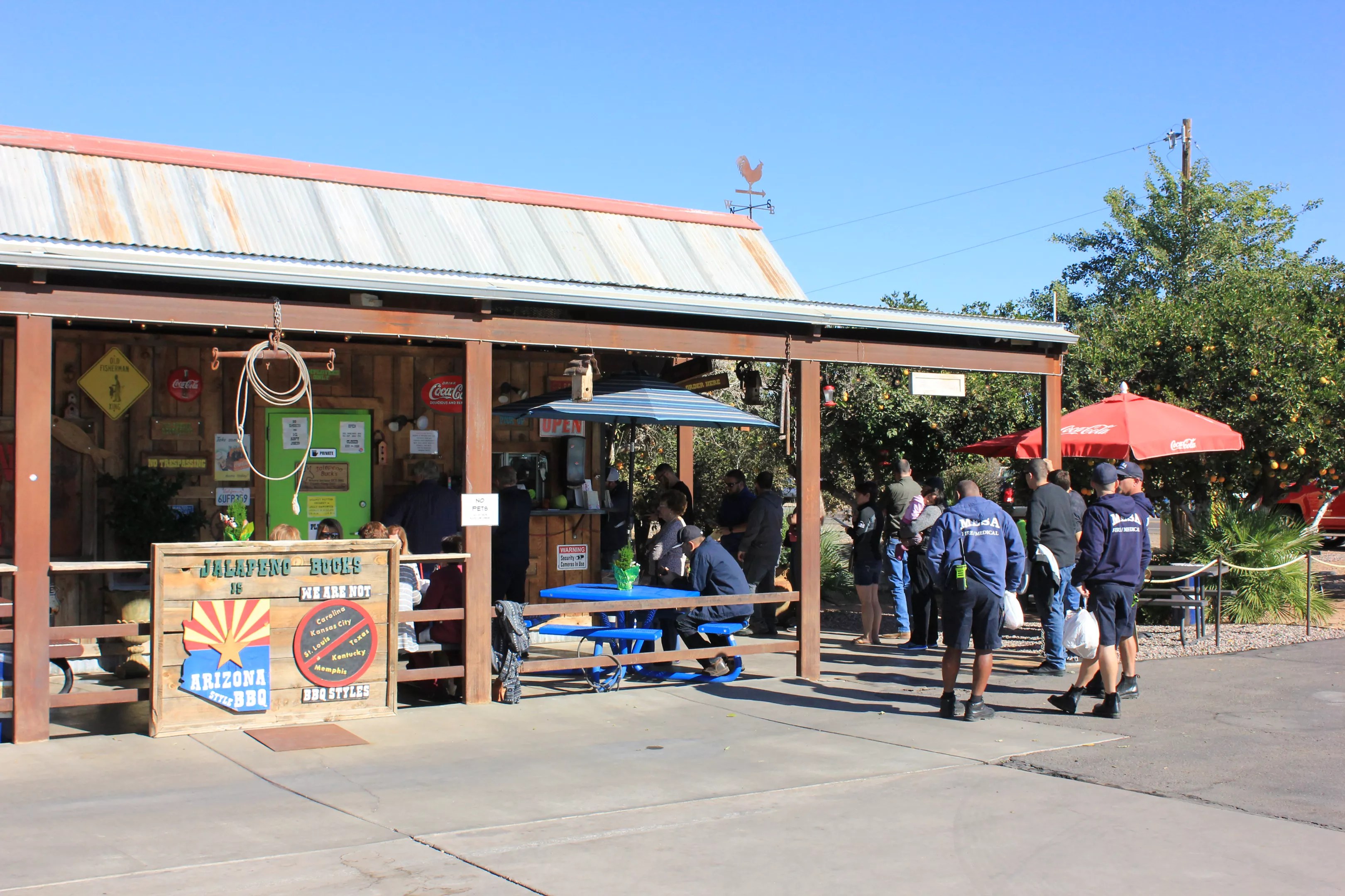 Some tables are out in the swaying trees. You can smell faint orange in the air until the food comes. Then you smell tomato-based sauce and smoky char, toasted flour tortillas and fragrant pork. Firefighters and other Mesa folks who frequent Jalapeño Bucks sit eating barbecue with sides of Mexican rice and refried beans.