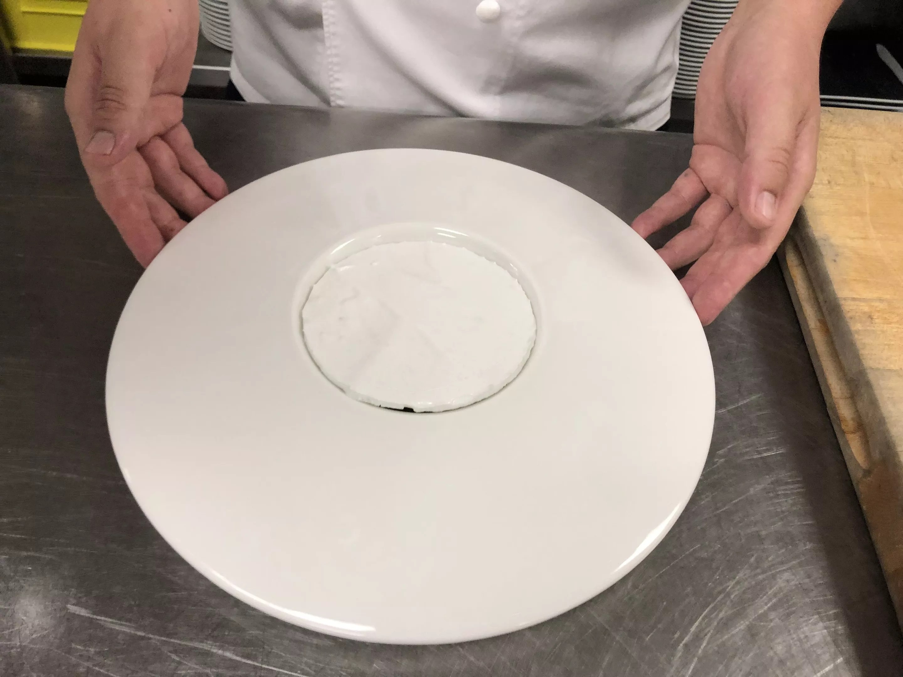 The plate is a yawning saucer sloping up to a raised center: a circular hollow. Now, Swanson sets the pie in the hollow. Atop the pie he adds a flat circle of meringue – perfectly cut to fit the hollow, obscuring the pie beneath.