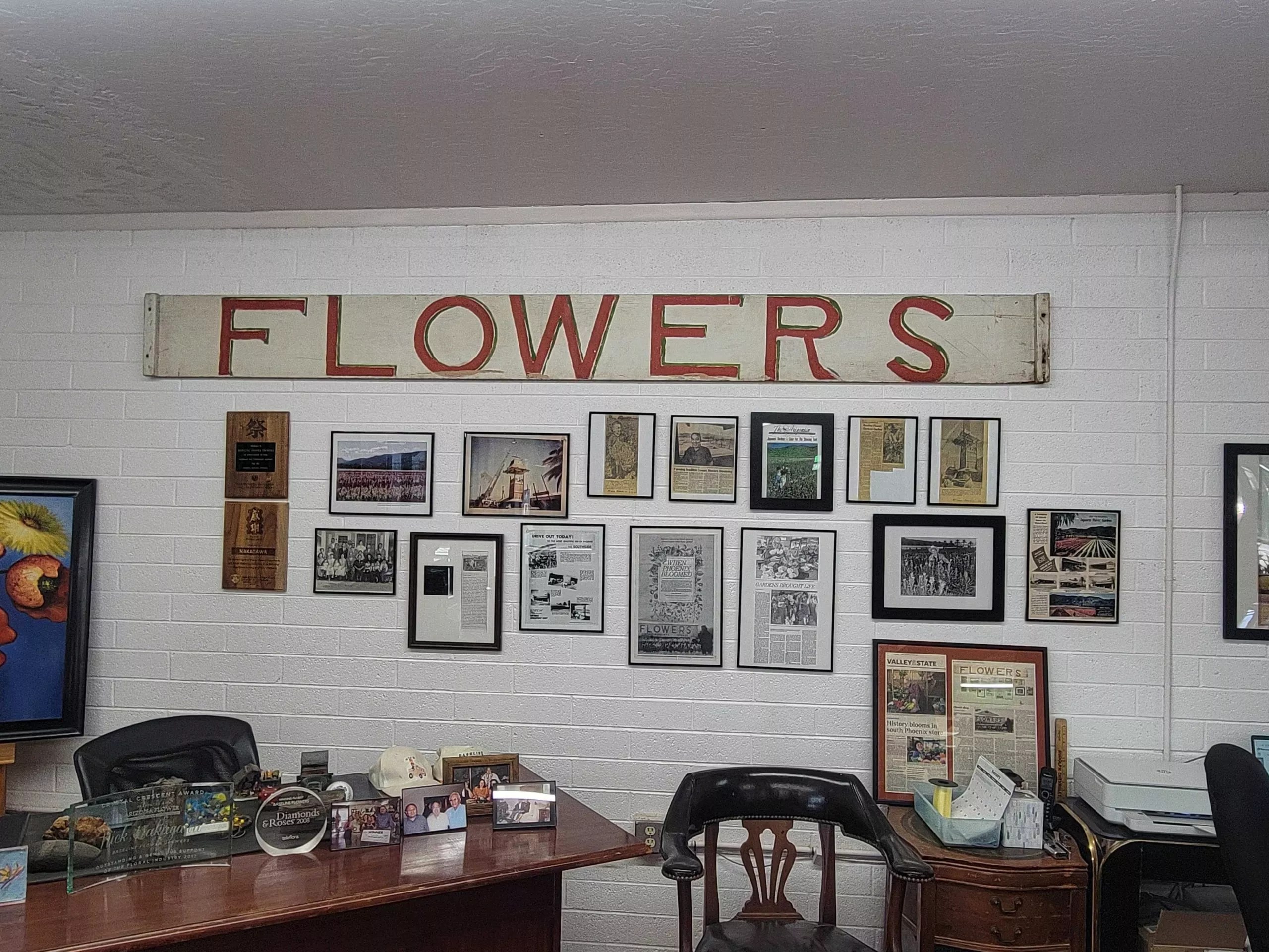 The original sign from the first flower field storefront hangs on the wall at Baseline Flowers above a series of old photos and newspaper clippings.