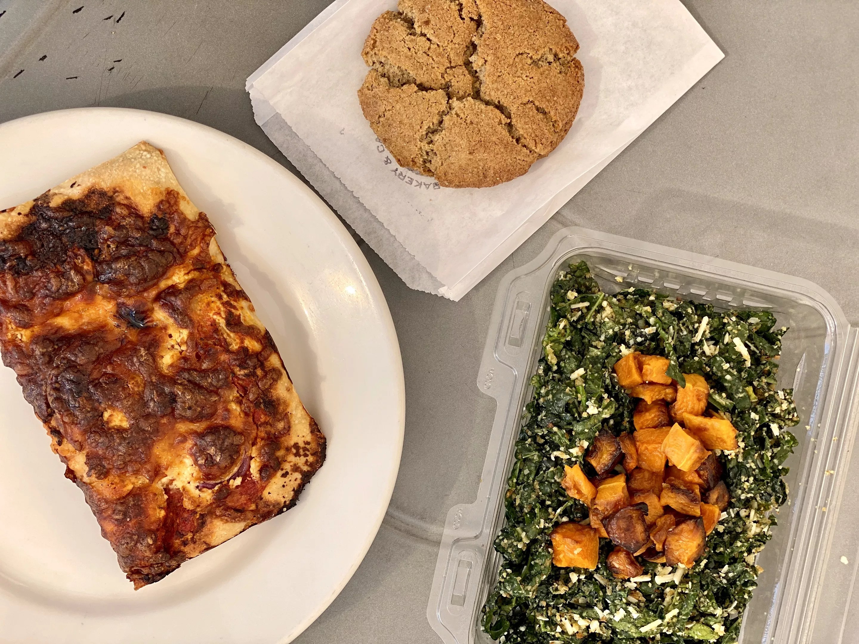 Pizza al taglio, kale salad with roasted butternut squash and chai snickerdoodle cookie at Pangaea.