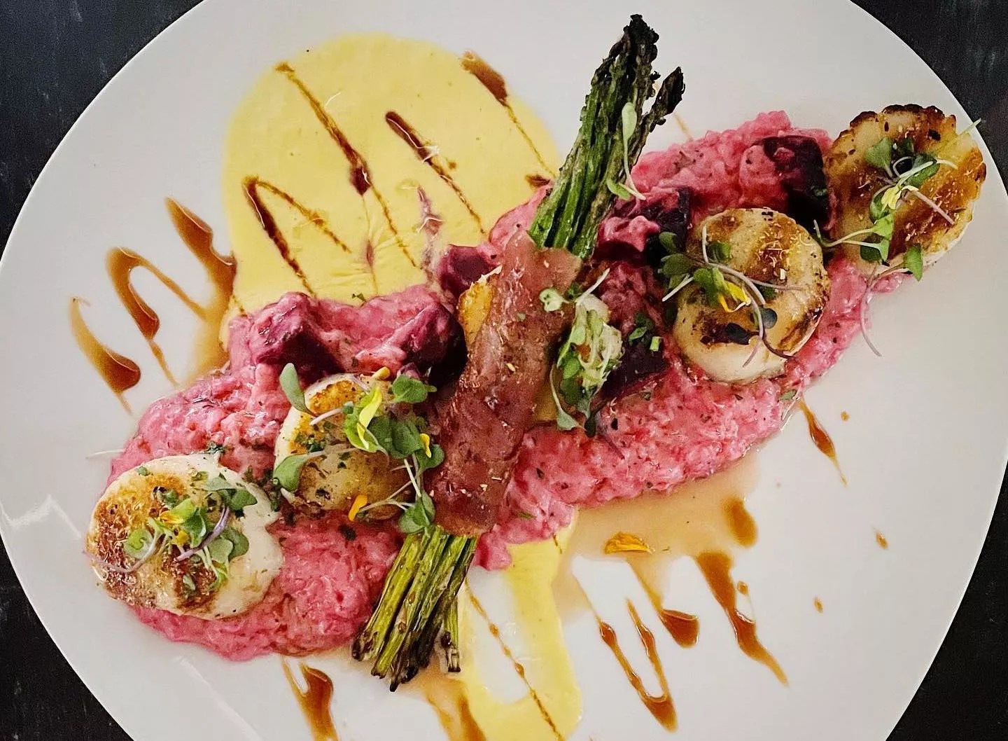 Feast on grilled wild scallops with roasted beet mascarpone risotto and prosciutto-wrapped asparagus at FARM Provisions.