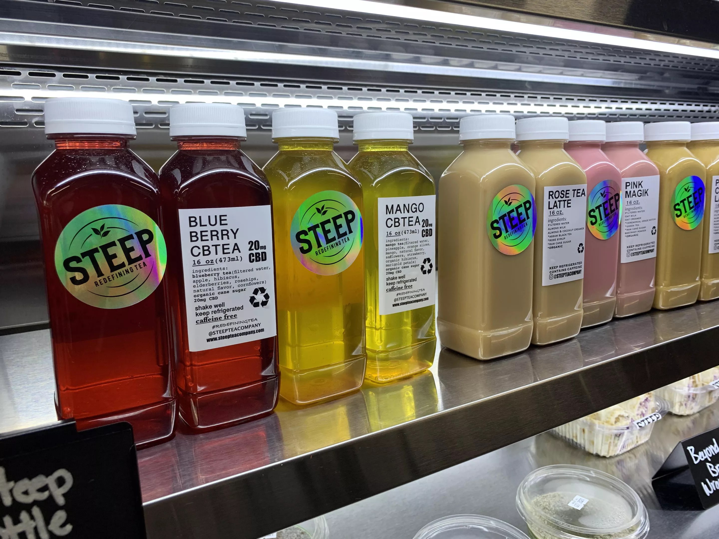 Currently, Steep produces a variety of colorful bottled drinks and a canned Lavender Lemon Balm sparkling CBTea – a 12-ounce chilled brew with 20 milligrams of CBD extract.