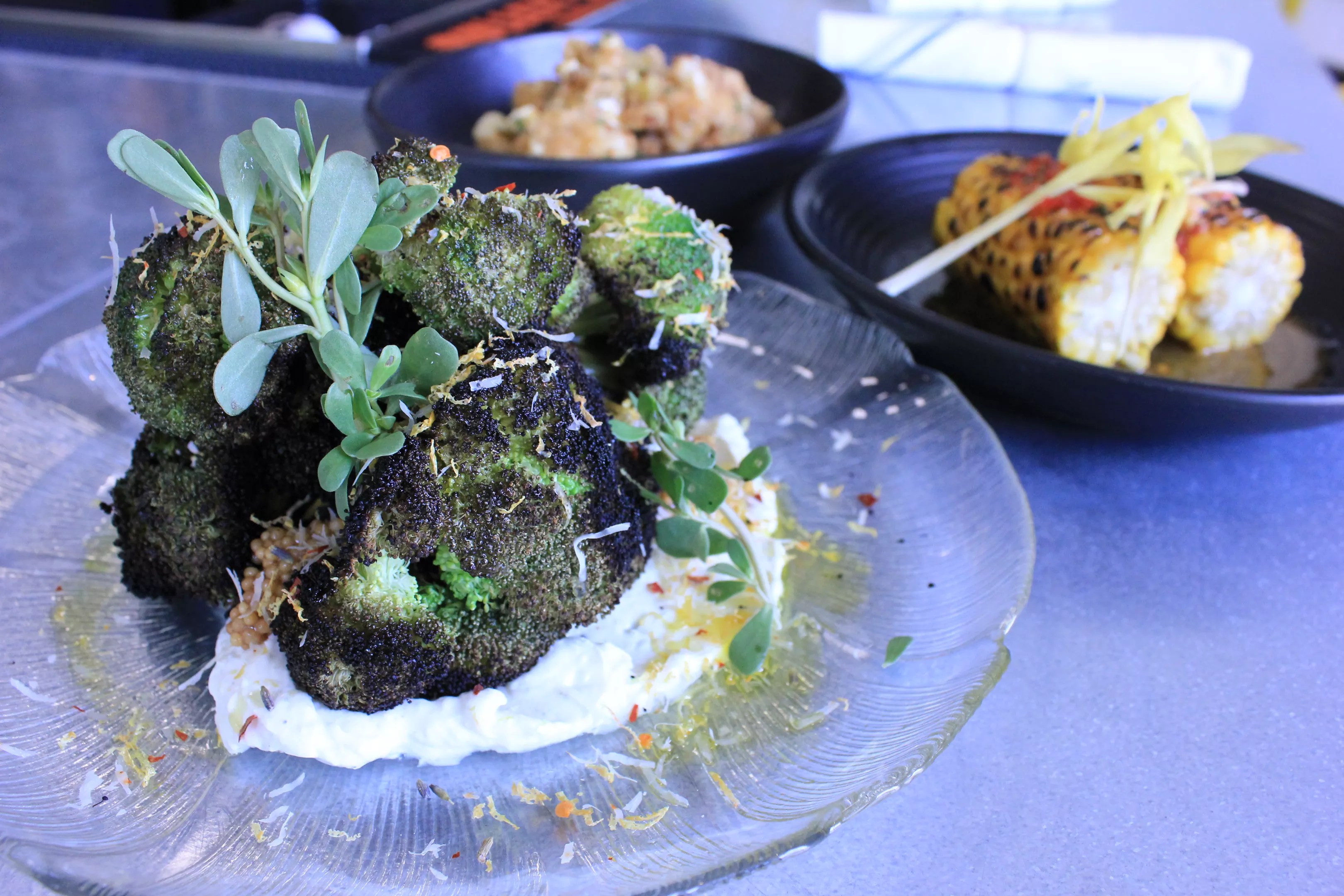 Shrimp toast has avocado, three kinds of corn, and radish coins edged in purple. Onion skins and other scraps are burnt to an ash and used on salads. Rather than stick to traditional soul or Southern fried chicken or chicken wings, Jones jumbles the formula and uses pickled celery, smoked bleu cheese, clarified butter, two kinds of Cutino sauces, and skips bird for cauliflower.