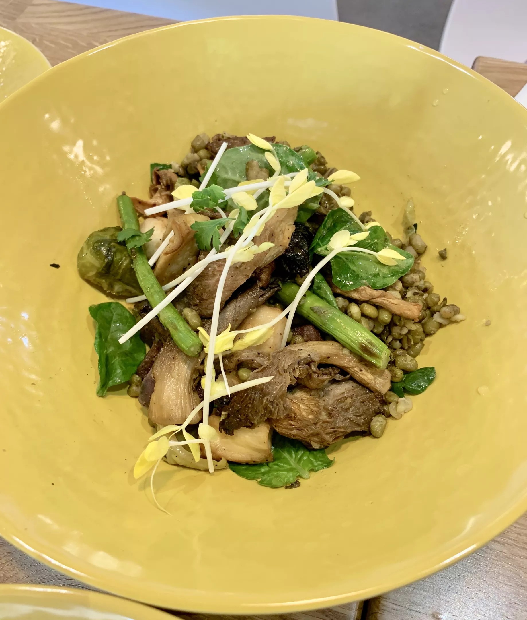 The Terra bowl came with mung beans, chunks of wild mushrooms, roasted Brussels sprouts, asparagus, spinach, and purple yam, with parsley and yellow pea shoots tossed on top. Again: fresh, bright. We ordered the suggested pairing of chimichurri sauce, which complemented the fish well. The mushrooms were a little chewy.