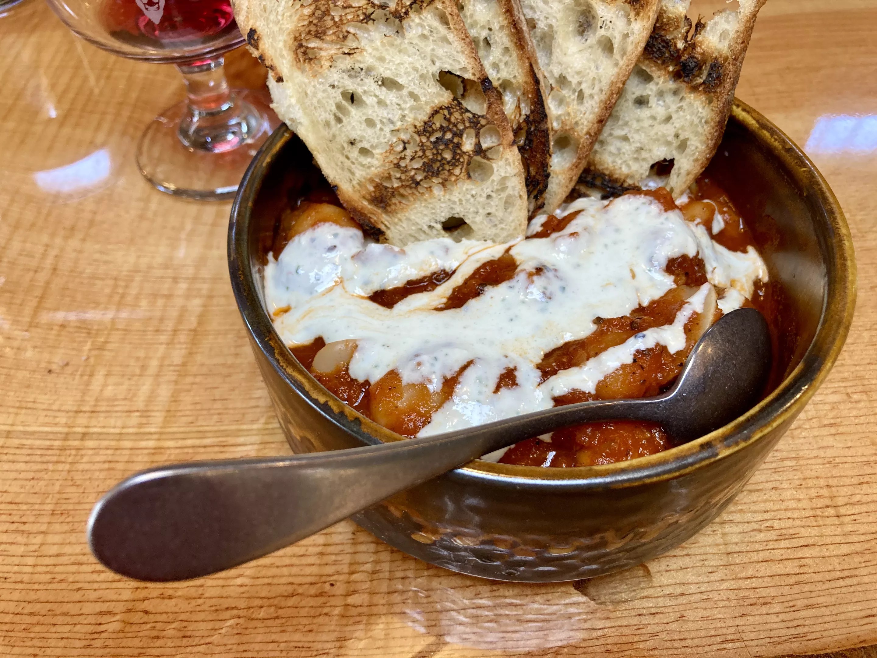 The Gigantes are thumbprint-huge white beans in a heavy, herbaceous tomato sauce topped with oregano cream (the last part is what sold me). It’s served in a heavy ceramic bowl with the tips of grilled baguette pieces already dunked in. This was a hearty dish, warm and truly a meal on its own. The beans and tomato sauce mixed so well together I forgot about the bread. The best part? Only $6.