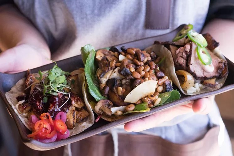 Tacos from left to right: mesquite honey chicken, seasonal vegetables (including tepary beans), and coffee-rubbed tri-tip.