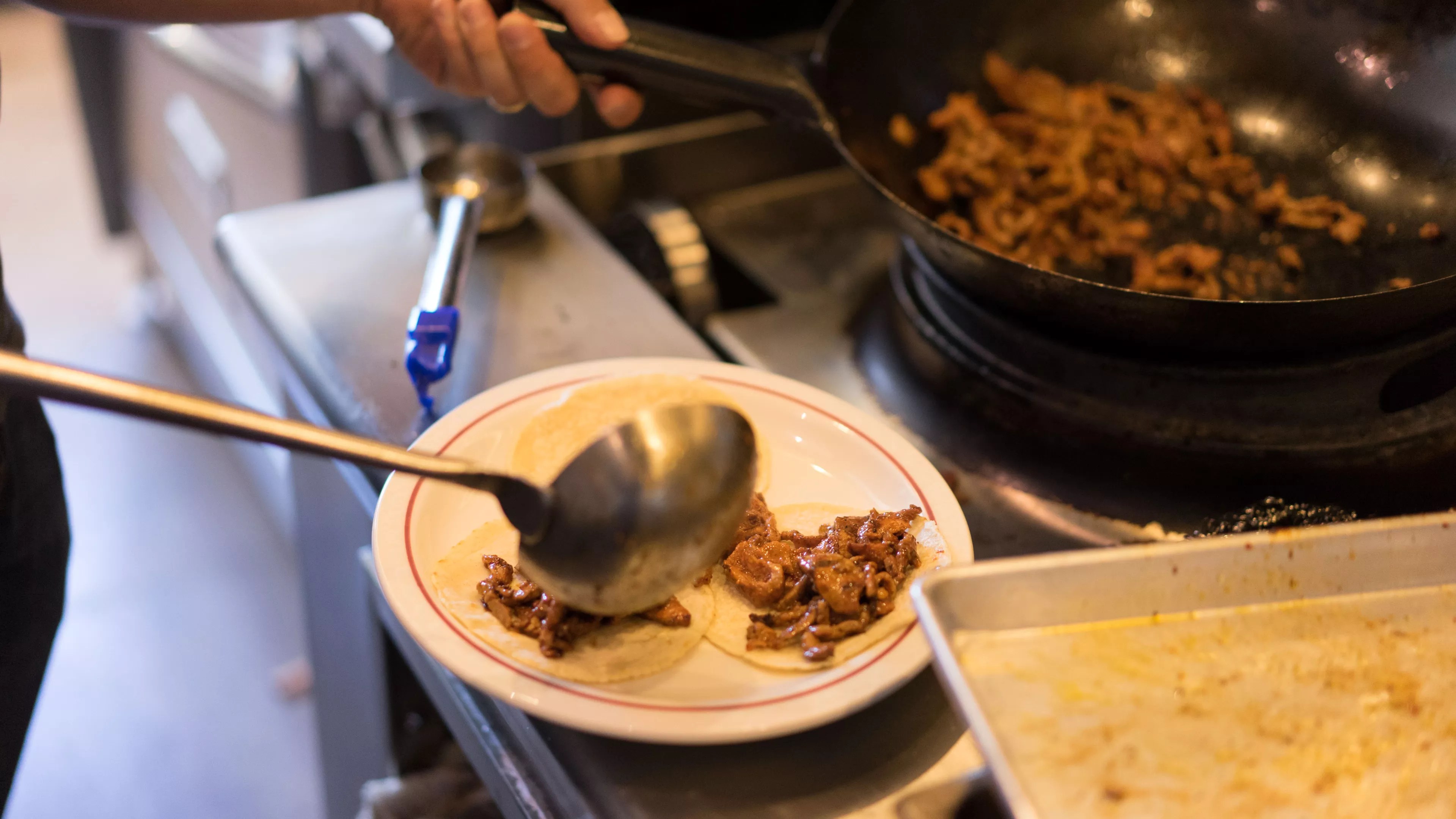 Al pastor, grilled over a wood fire and then finished in a ripping hot wok, comes together atop tacos, topped with onion, cilantro, and a thin sliver of pineapple.