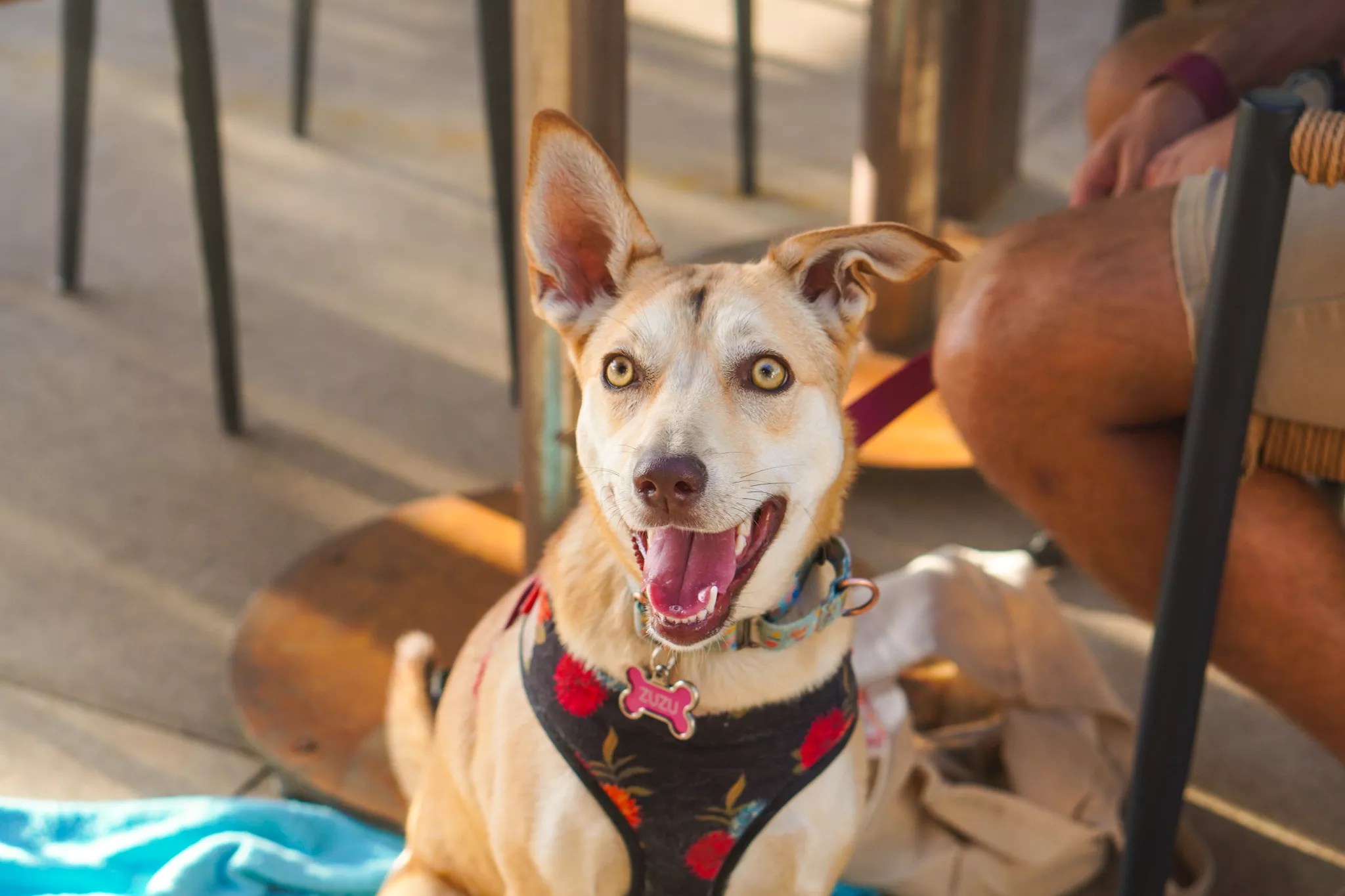 Customers are welcome to bring their own pets to Pizza to the Rescue. Zuzu enjoys the lively scene on the misted pet-friendly patio during dinner service.