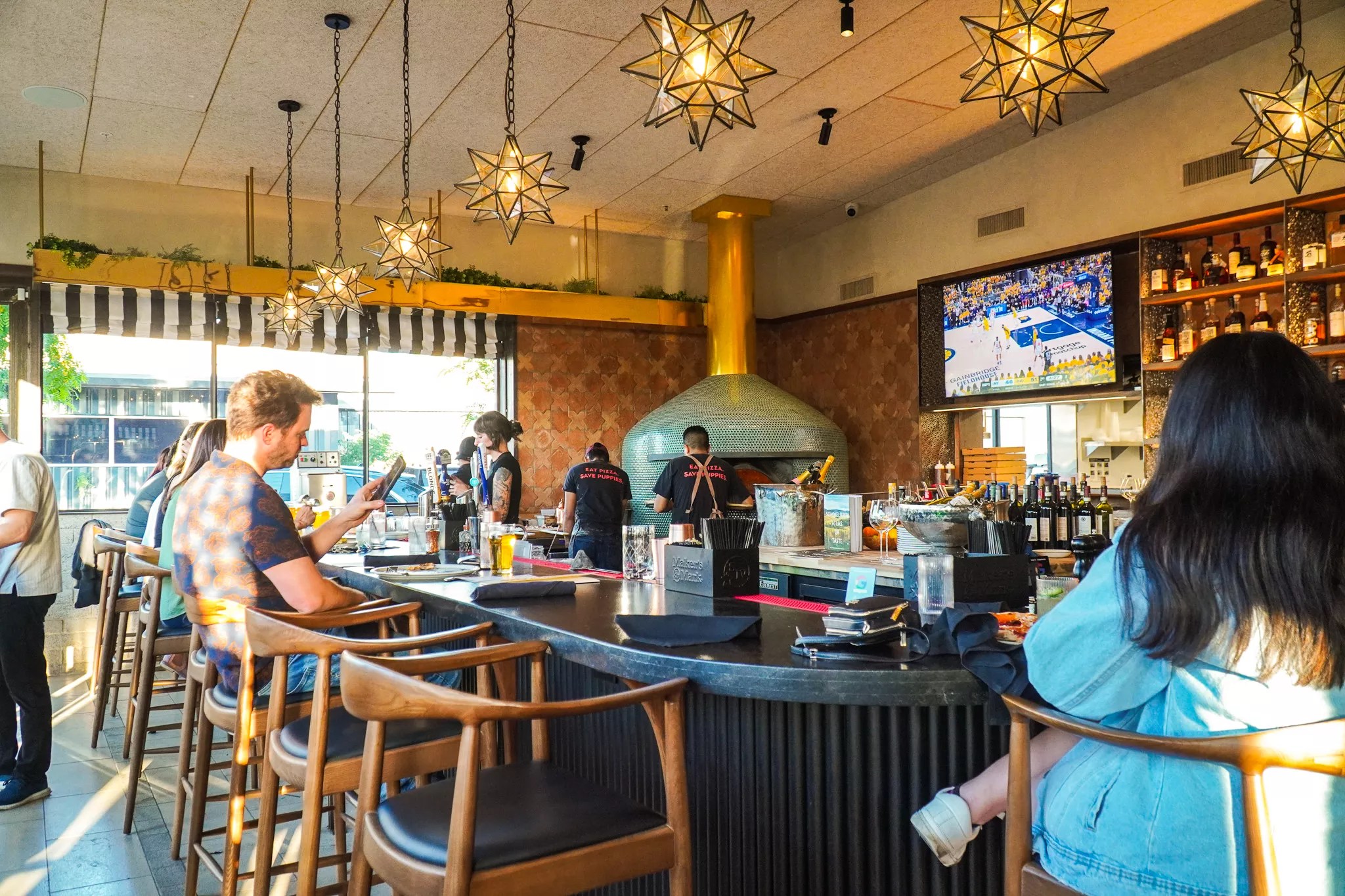 A custom Italian-made pizza oven is the centerpiece inside the bar area at Pizza to the Rescue.