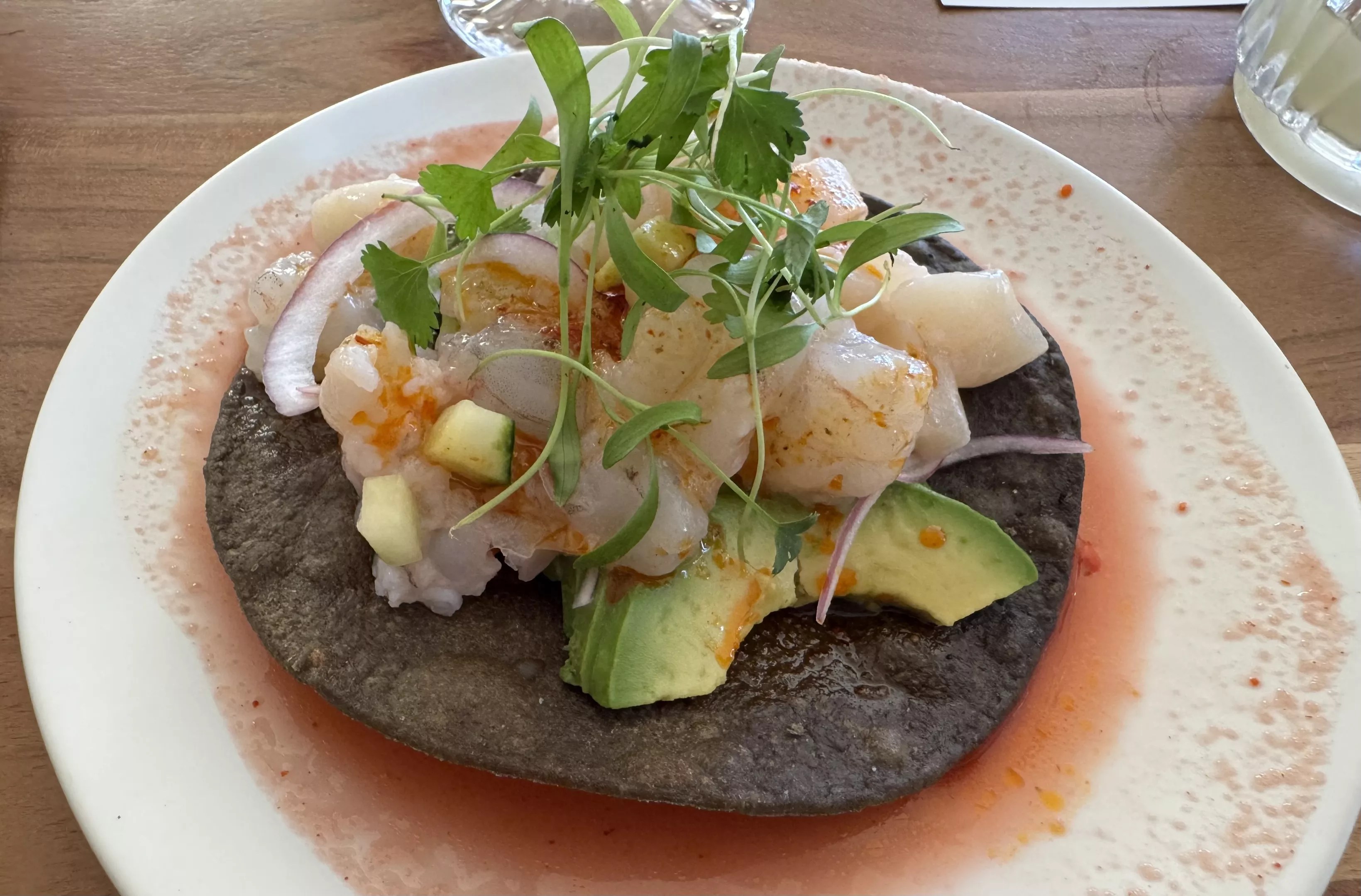 A shrimp and scallop tostada with a prickly pear aguachile.