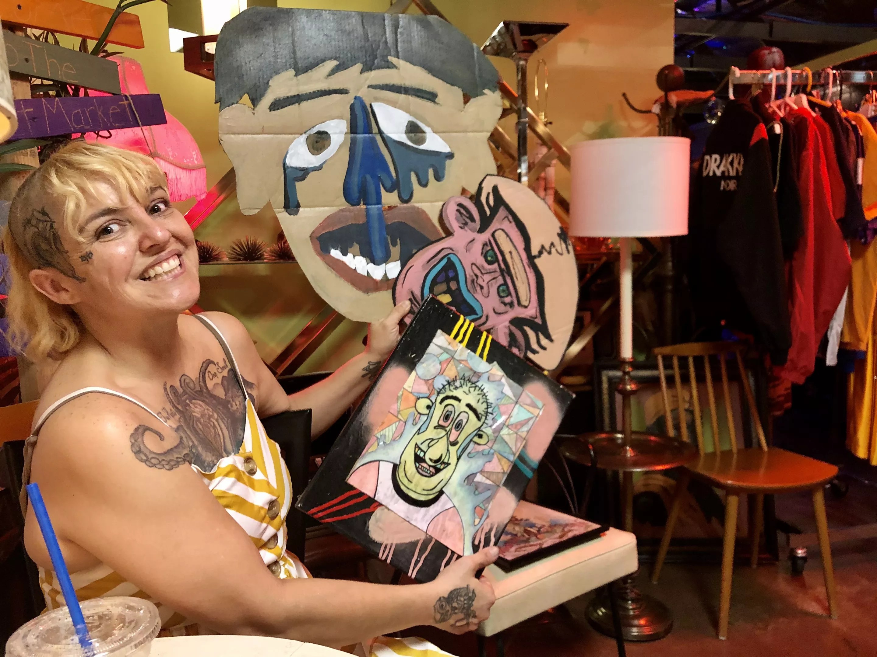 Among the artists showing on a recent Saturday was Patricia “Patty” Pino. Originally from Long Beach, California, Pino now lives in Tempe and works in a variety of art mediums. She makes cardboard cutouts and paints on canvas or slabs of drywall. She gravitates toward drawing noses and missing teeth because she likes “people’s imperfections.” (Her art name is “Bananas n Cucumbers.”)