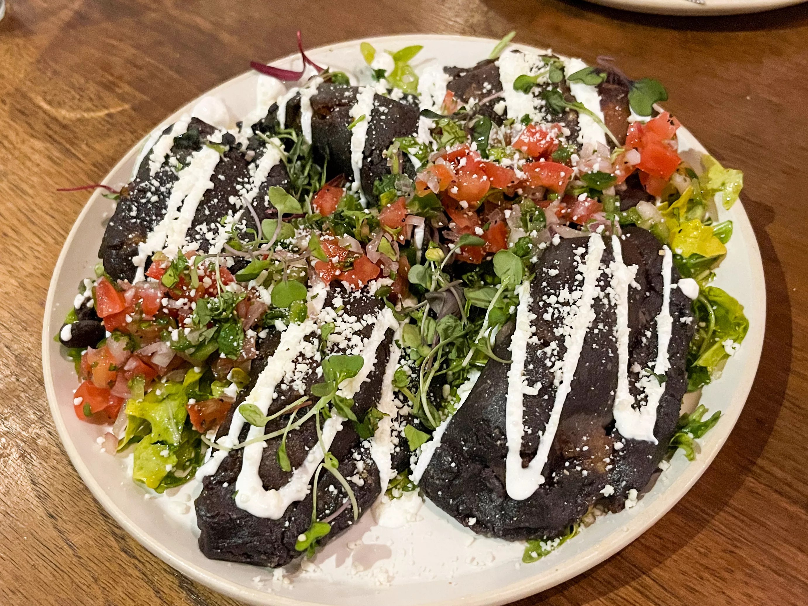 A different dish, to be sure, but the blue heirloom corn empanadas hit the sweet spot that the tacos de papa just missed. Their flavor is gentle comfort, with a filling that’s more about the potato and less about the chorizo and cheese accents. But the texture of these deep blue beauties is dynamite – a hot and steamy filling enrobed in a crunchy coat, topped with a cooling punch of fresh pico and crema.