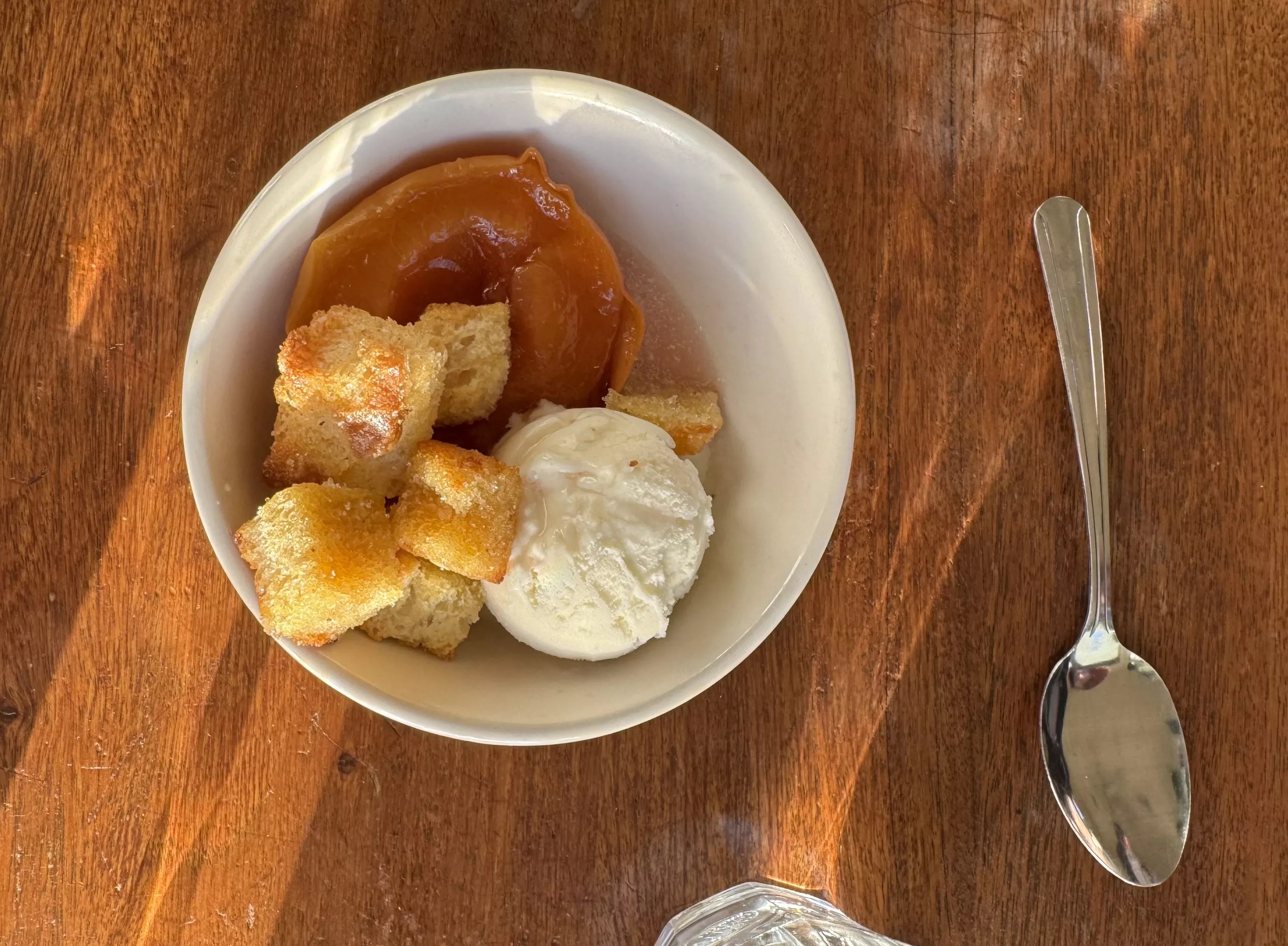 Dessert at a recent pop-up by Mas Amable and chef Devan Cunningham was a rosé-poached peach with taleggio ice cream and sweet croutons.