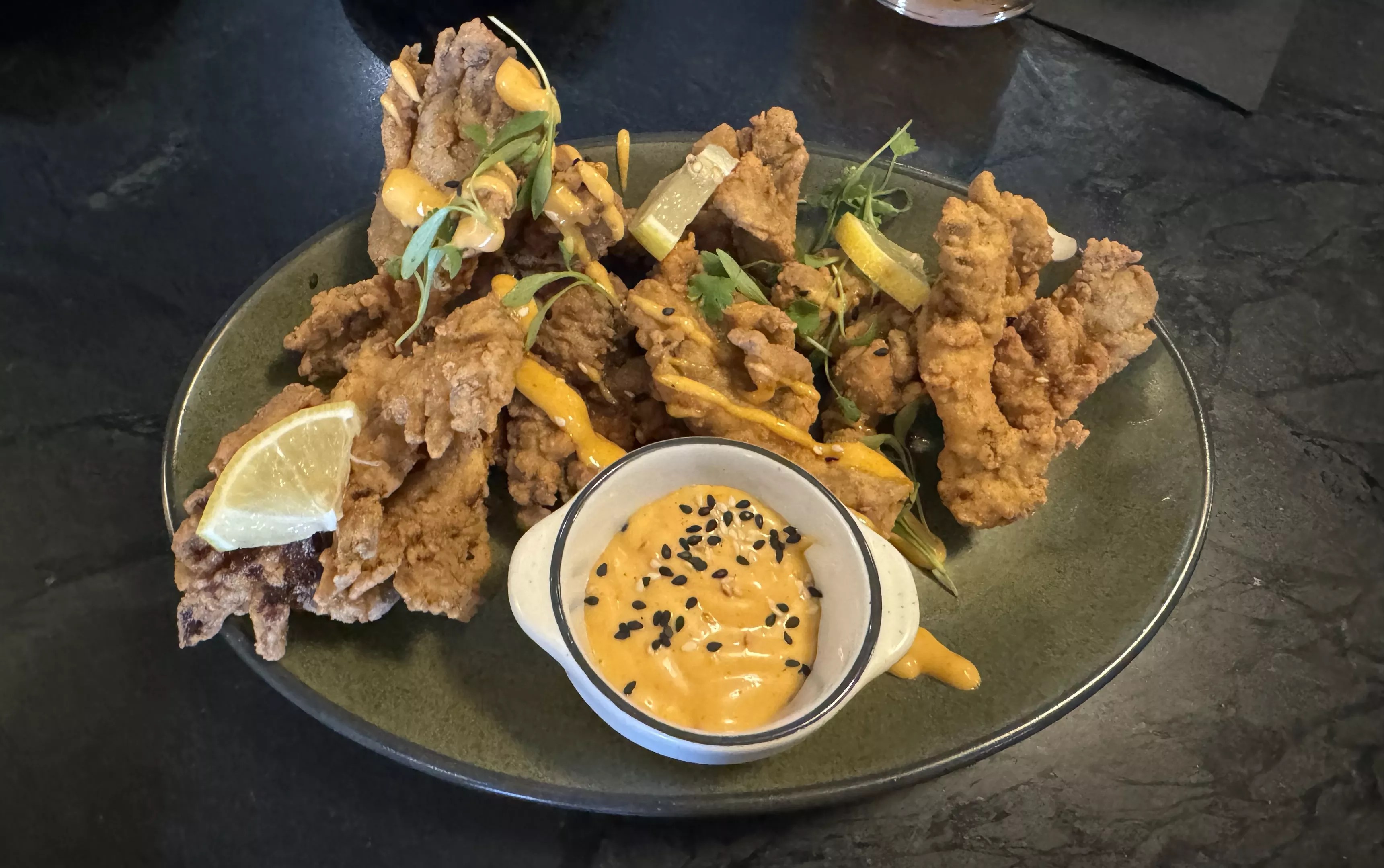 The Mushroom Calamari is a surprising, savory starter that shouldn’t be missed. It gets added zip from a kimchi-infused dipping sauce.