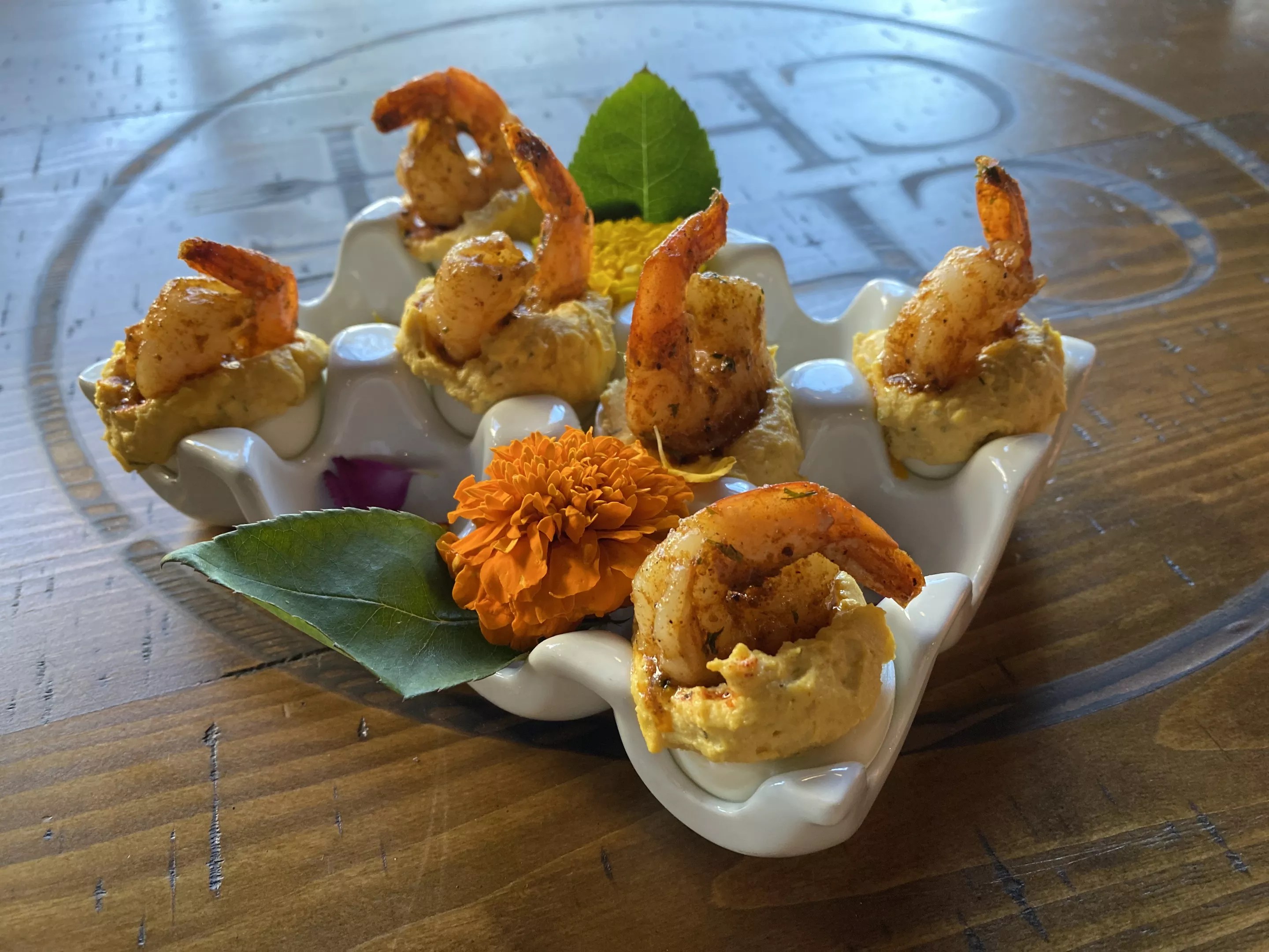 The La Di-Da-Dis, deviled eggs topped with grilled Cajun shrimp, are a customer favorite, Fields says.