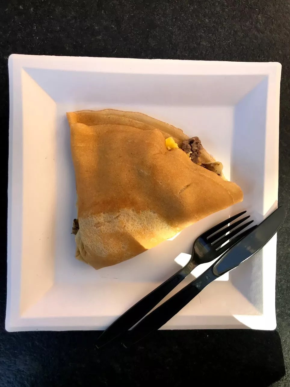 The Crepe Club serves savory breakfast crepes, too. And it serves them all day. A sausage crepe comes filled with egg, sausage, potatoes, and cheddar.