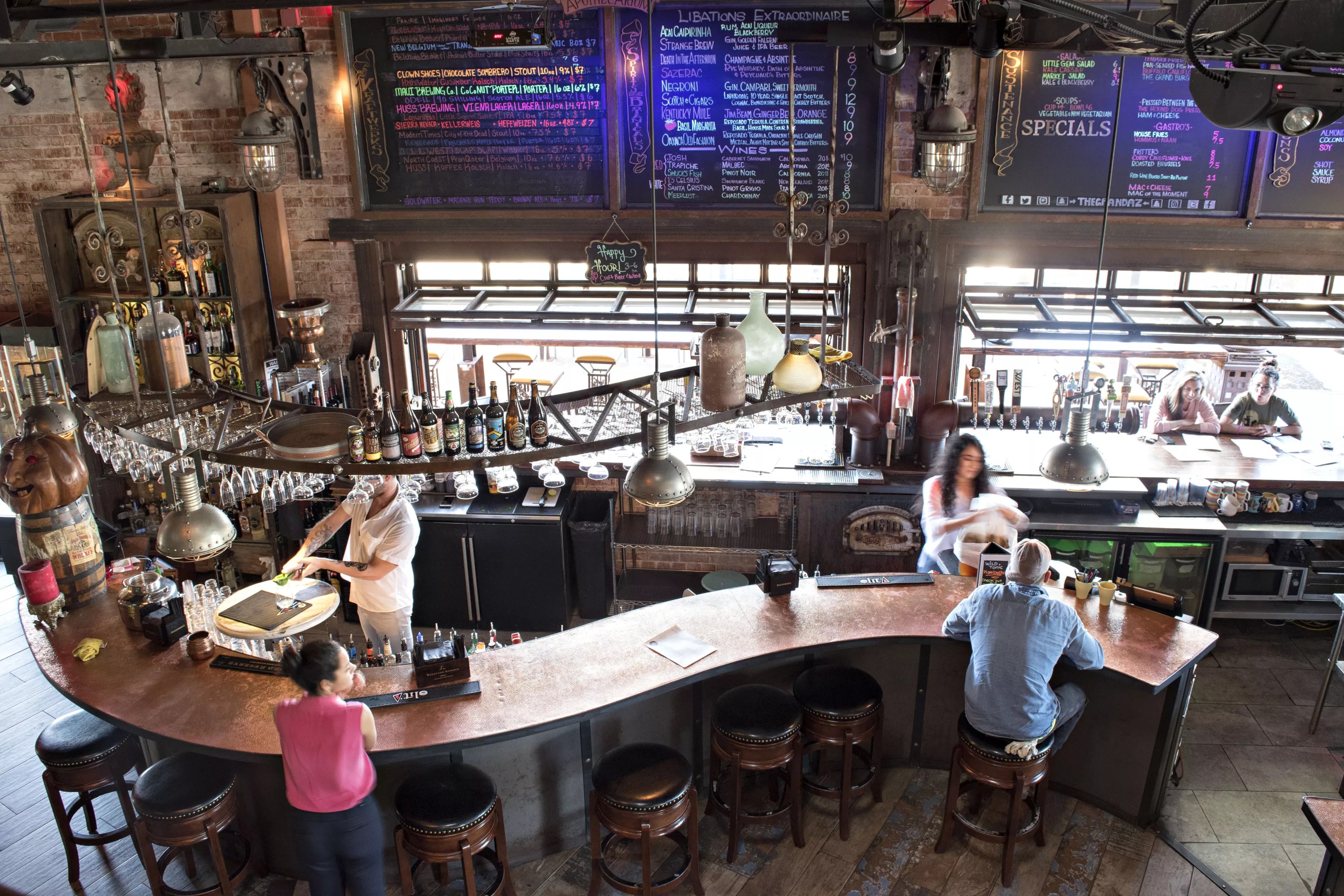 The sprawling 15,000-square-foot space, though, has been re-envisioned. It’s now a glowing temple of steampunk-inspired design, with visual tributes to New York’s Grand Central Station. The space feels theatrical, in the best sense possible, thanks to lighting and decorative flourishes that double as Victorian-era set pieces. Vintage light fixtures dangle from the high, industrial ceilings. Old-fashioned train station timetables grace the exposed red brick above the bar, which itself features a serpentine, copper-topped counter. The space is full of intriguing nooks and crannies, including a speakeasy, Sanctum, which is tucked into the venue’s small second floor. There’s also a comfortable beer garden with ample seating, and a smaller sidewalk patio that faces Central Avenue.