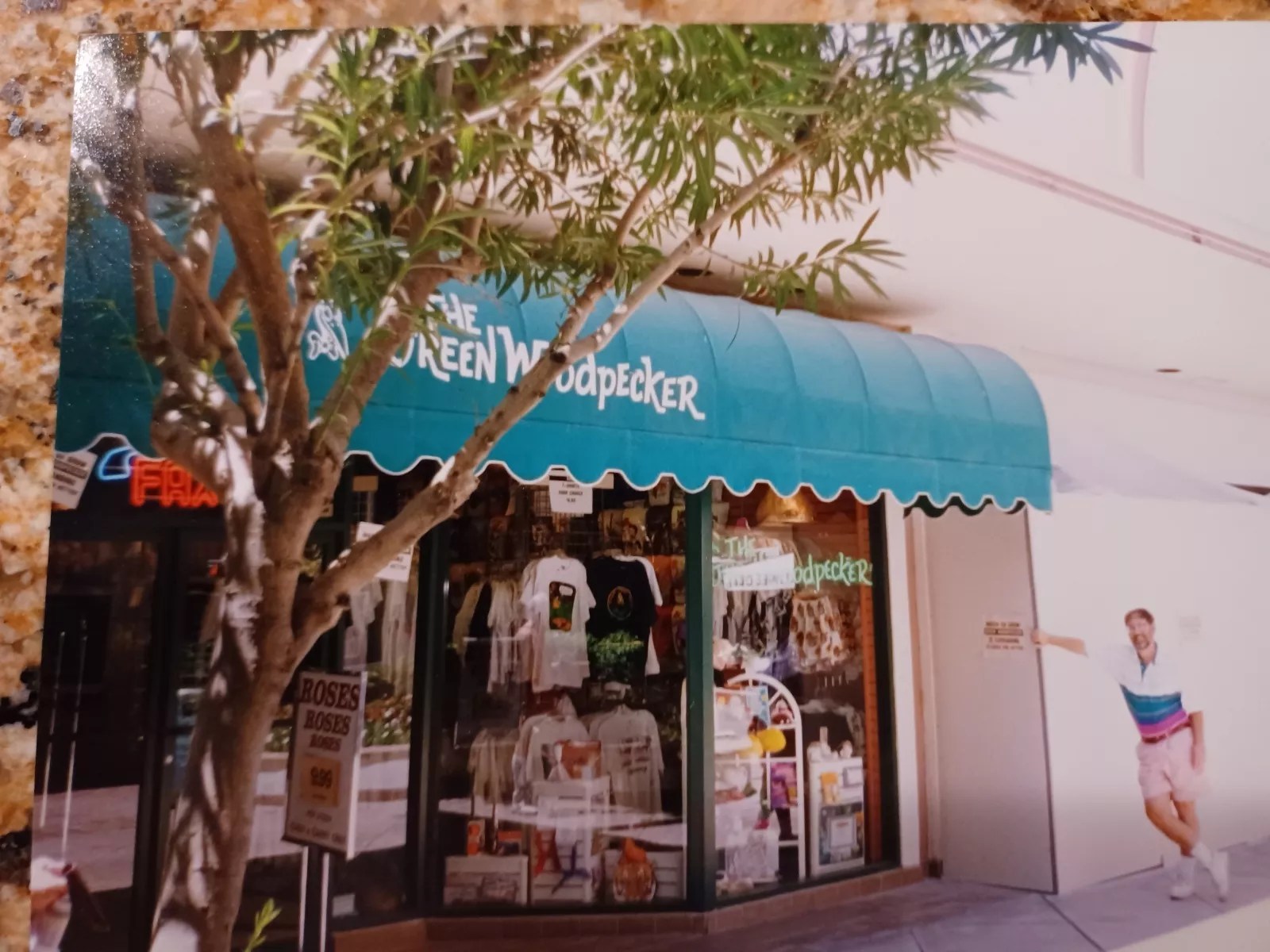 The owner of the original Green Woodpecker flower and gift shop, Charlie Sands, stands outside the shop.
