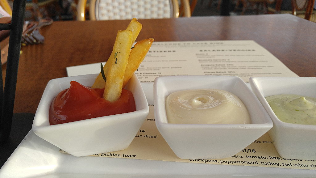 They come wrapped in paper, with a sprig of crisped up rosemary tucked into the bouquet of hot, herb-perfumed fries. They are thick-cut, blanched, and fried at least twice, a process that renders them extra-crispy. The soft, tender-inside texture of each fry is left nicely intact. They come with a trio of very good dipping sauces: a dill-infused sauce vert, a creamy garlic aioli, and a truffle-laced ketchup that easily puts a packet of Heinz to shame.