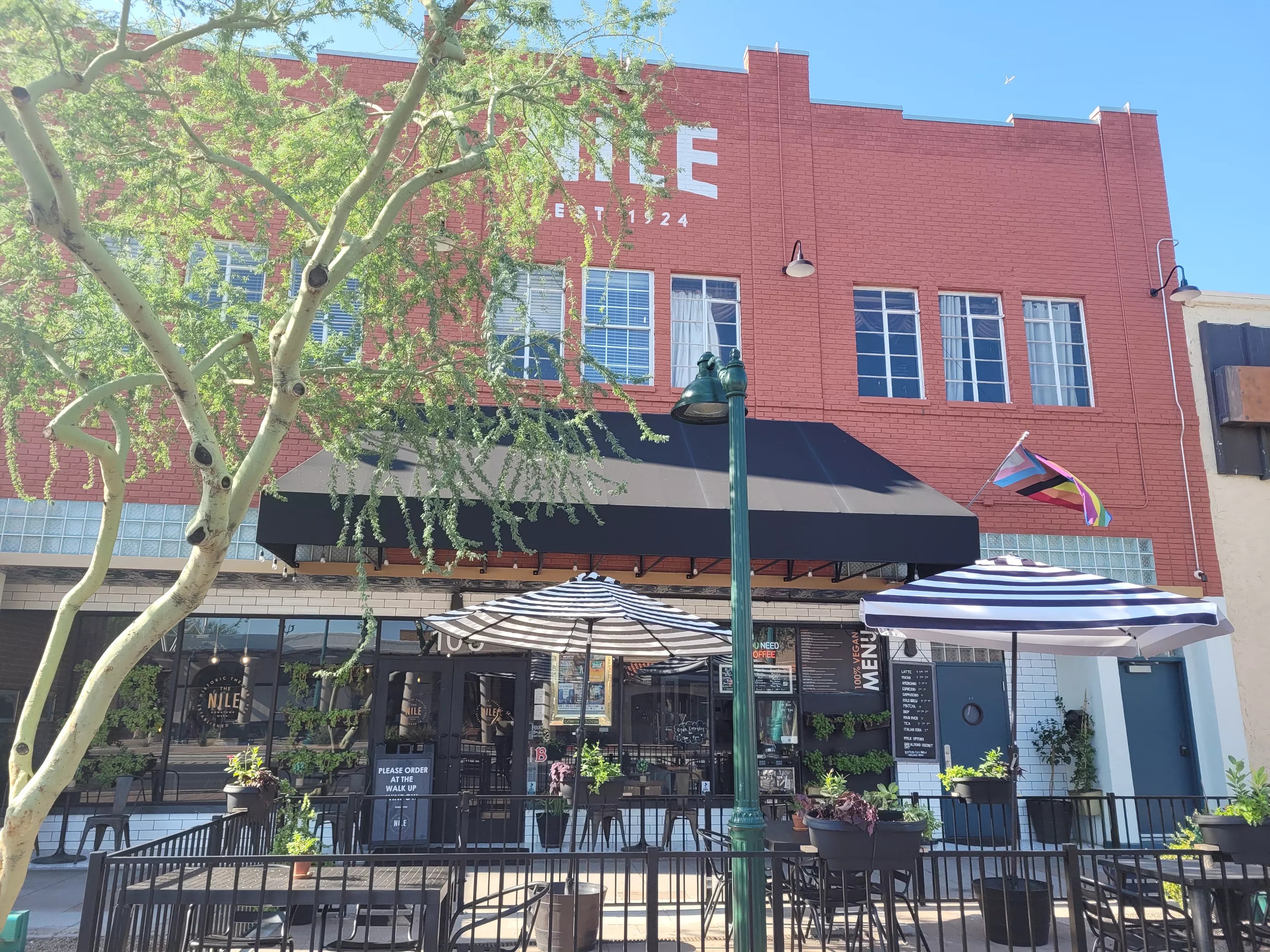 Over the past six years, The Nile Theater has undergone extensive exterior renovations, become a certified Green Business, made the shift from being a vegetarian venue to being vegan, launched a vegan hot dog cart, and converted a horse trailer into a coffee shop during the early days of the COVID-19 pandemic.