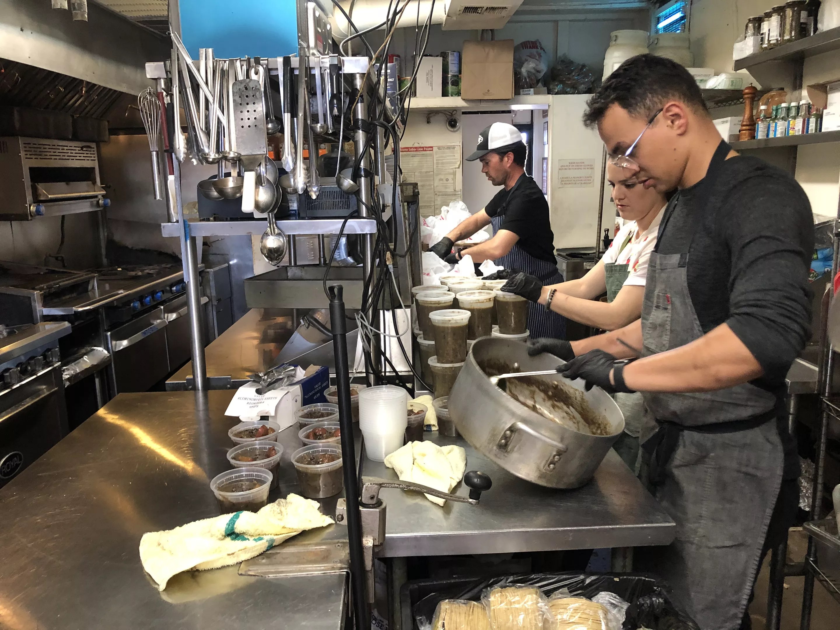 On Monday, Chef Samantha Sanz from the now-temporarily closed Talavera came by with her Sous Chef Victor Davila and Executive Chef Chuck Kazmer. They bustled in the eerily deserted Barrio Cafe kitchen, portioning corn tortillas, spooning rice, simmering a steel vat of carne de jugo – meat braised in its juices.