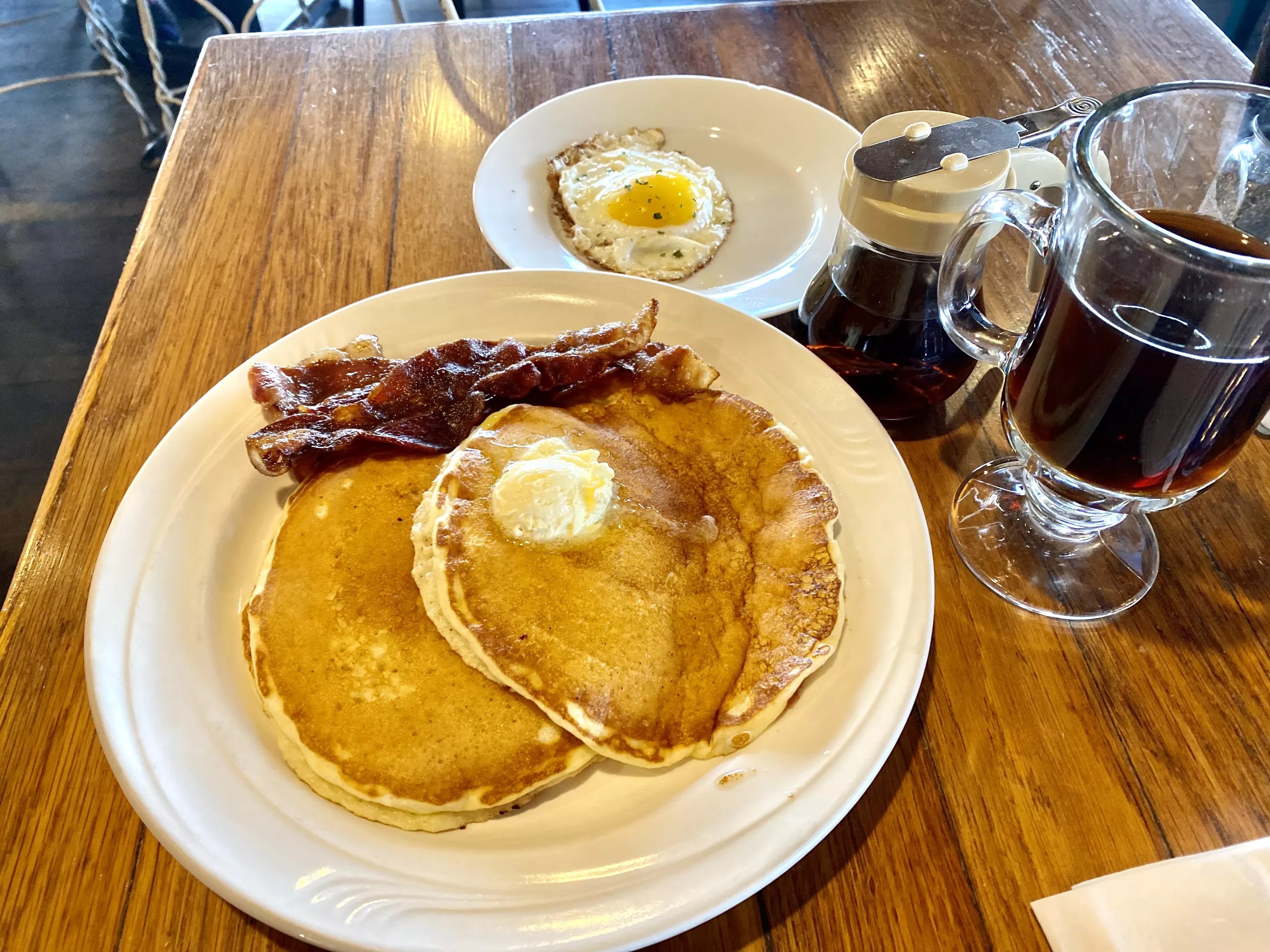 The pancakes at Kiss the Cook pair well with bacon and an egg.