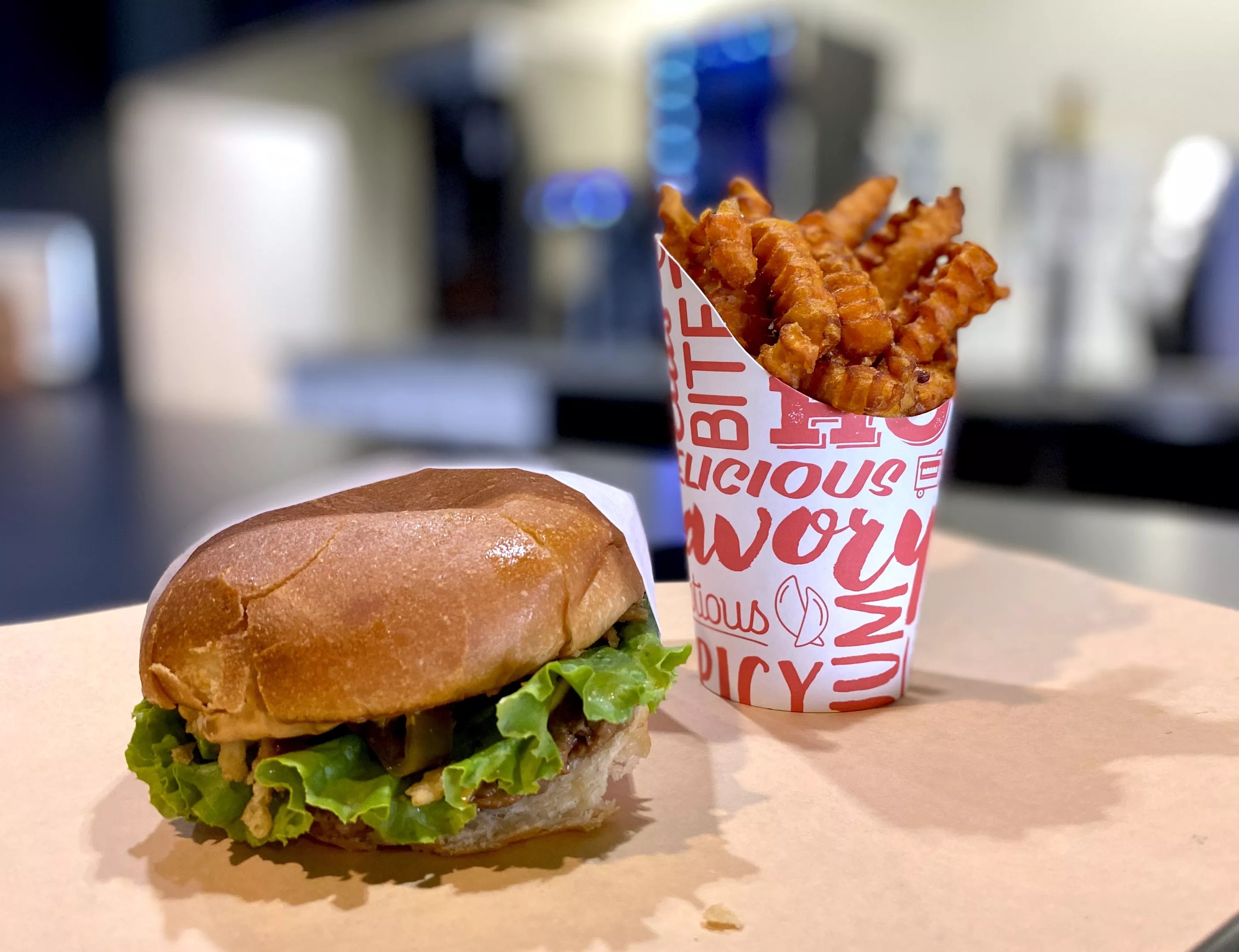At UNiQ Burger, the Southwest Burger is topped with avocado, jalapenos, fried onion strings, spicy aioli, and vegan cheese.