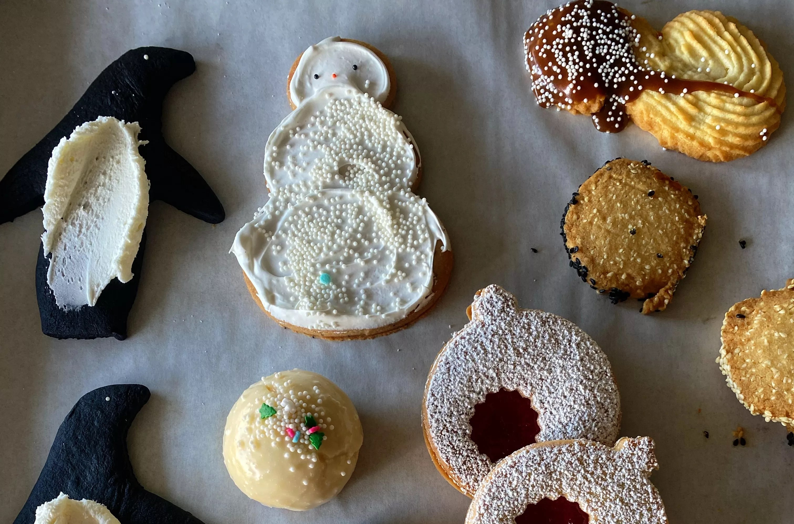 Items in The Dinersaur’s cookie box include black cocoa penguins and lemon-iced snowmen.