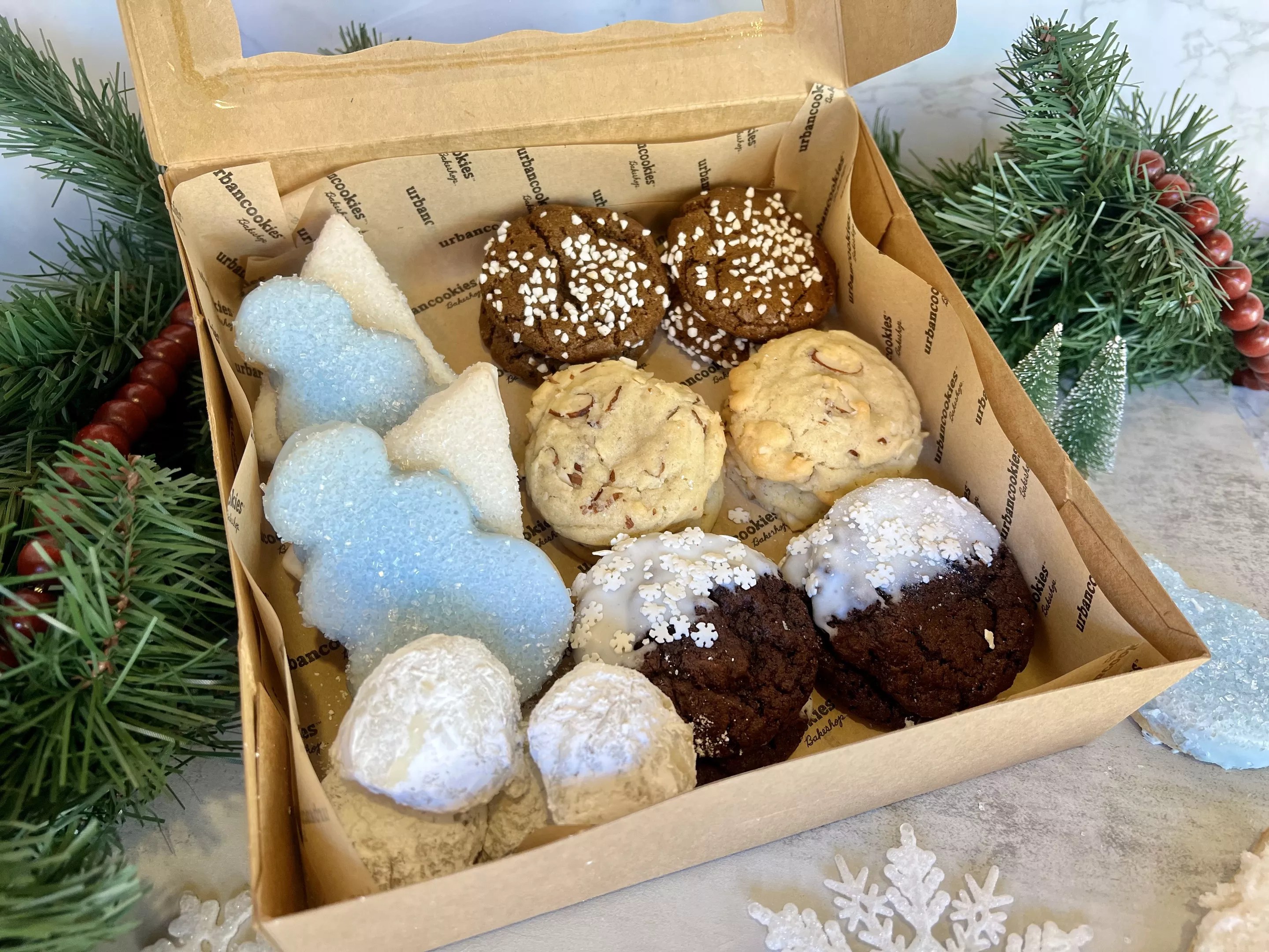 Decorated sugar cookies, almond amaretto, pecan snowballs, ginger molasses and chocolate snowflakes are part of the holiday assortment box from Urban Cookies Bakeshop.