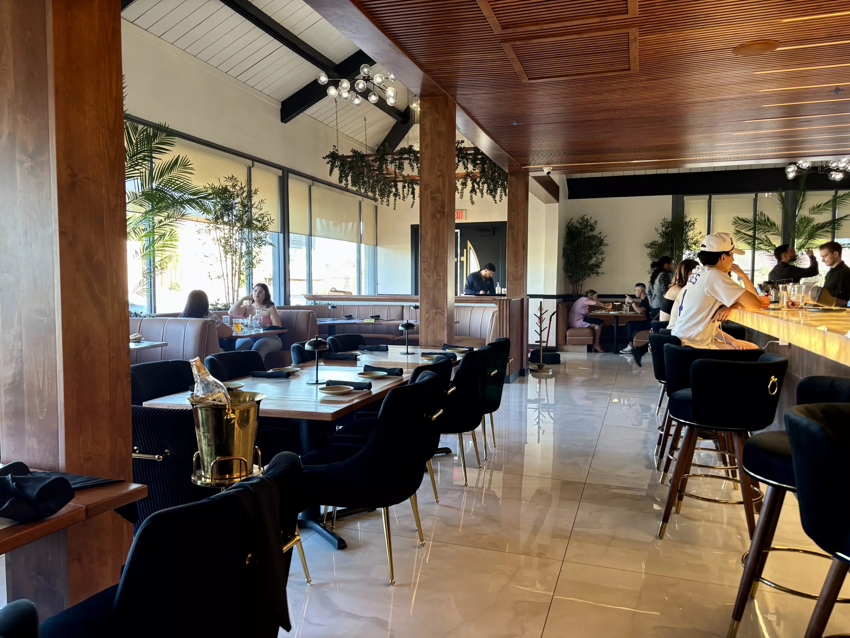 On a recent Saturday night, all the tables were booked, so the host, dressed sharply in all black, directed us to a seat at the bar. His slicked-back hair and gold chain caught the light, adding a hint of glam. A similarly dressed bartender welcomed us in.