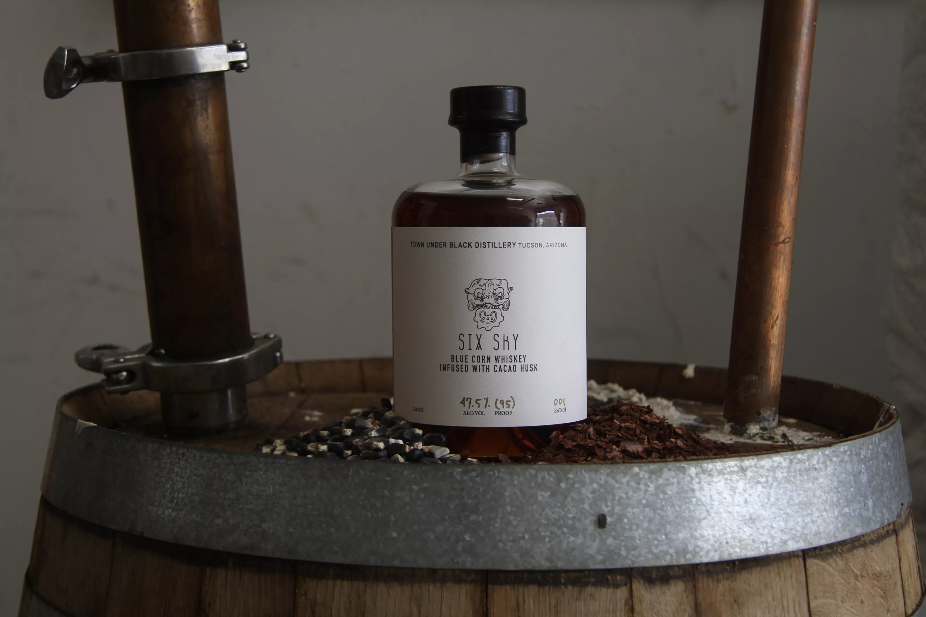 Town Under Black’s first spirit, Six Sky, is a 95 proof, 100 percent blue-corn whiskey steeped in cacao. Fermented in part using wild yeasts, distilled using what might be the only wooden still in the country, the whiskey rested in a vat with cacao husks for two weeks. They give the spirit its ruddy color. It hasn’t seen the inside of an oak barrel for a single heartbeat.