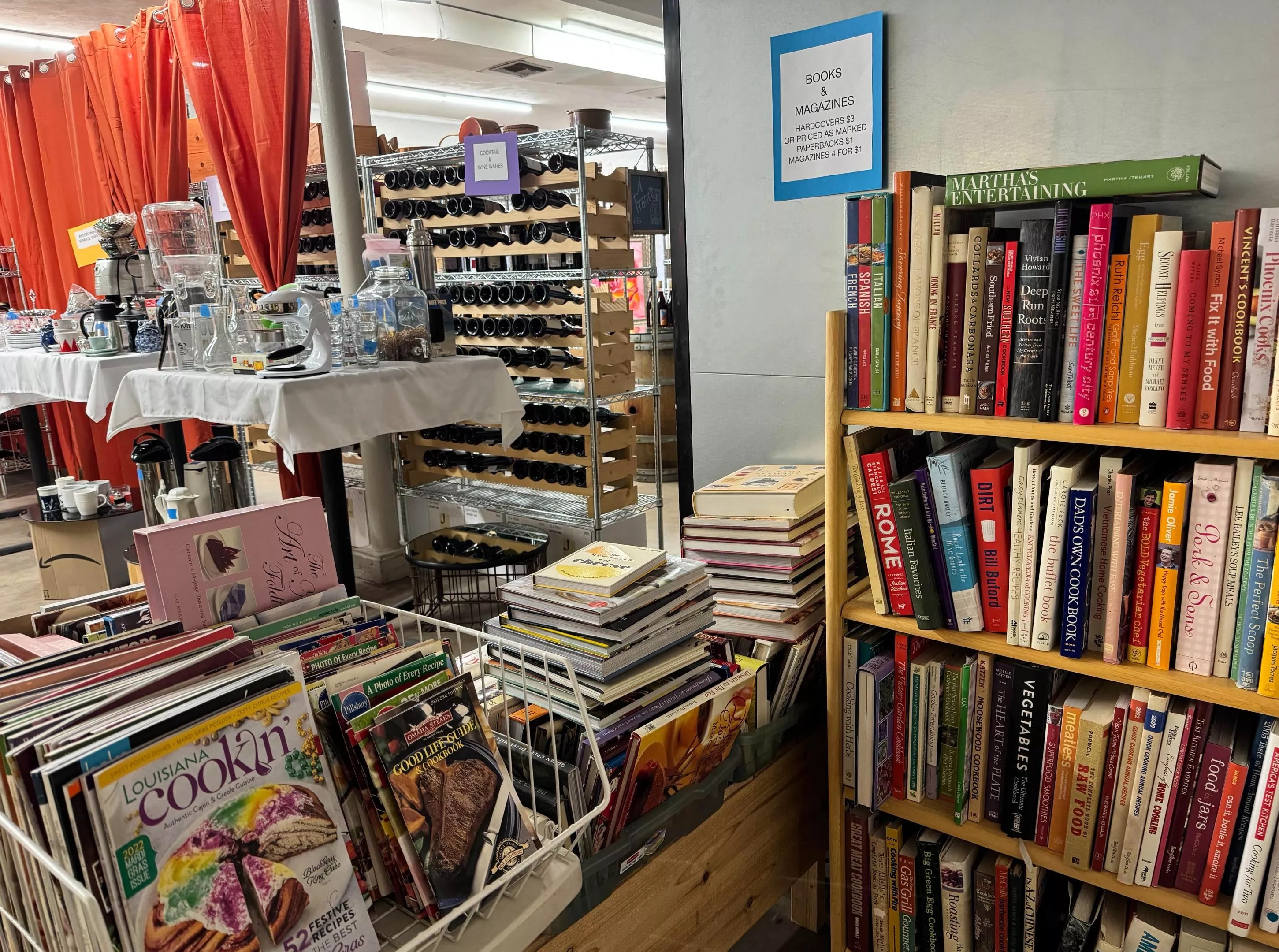 Organized on tables are vignettes of offerings. Mugs are grouped with French presses and a Cuisinart coffee maker. A black-glazed tagine sits next to steam baskets, which are tucked beside a fondue pot. Enameled pans are displayed, still in their original boxes. A sous vide cooker is placed alongside an Instant Pot, an air fryer and a meat-grinding attachment for a KitchenAid Stand Mixer. Heart- and lobster-shaped baking pans are stacked on a table next to boxes of brand-new Silpat baking mats and canisters brimming with wooden cooking utensils. A book nook features classic culinary reads such as “The Joy of Cooking” and “The Cake Bible,” as well as titles from Ina Garten, Martha Stewart and Milk Bar baker Christina Tosi.