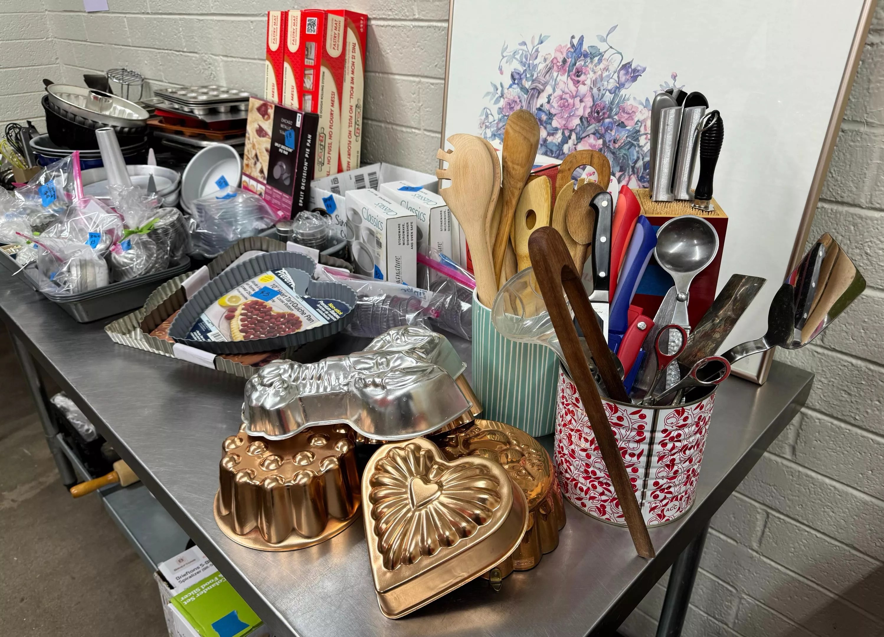 Baking items include heart- and lobster-shaped baking pans, brand new Silpats and six-inch cake pans.