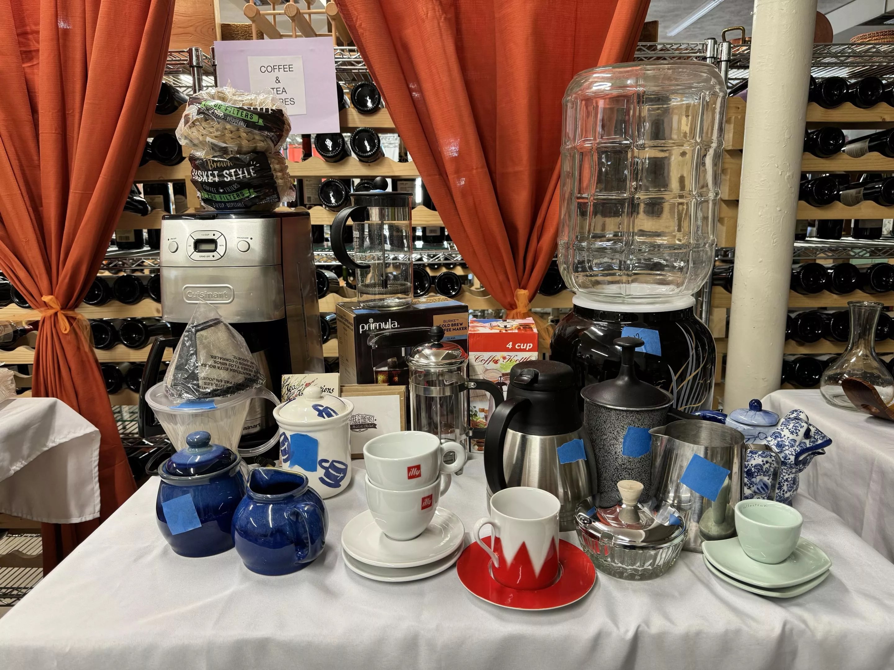 Items for coffee and tea include cups and saucers, French presses and a coffee maker.