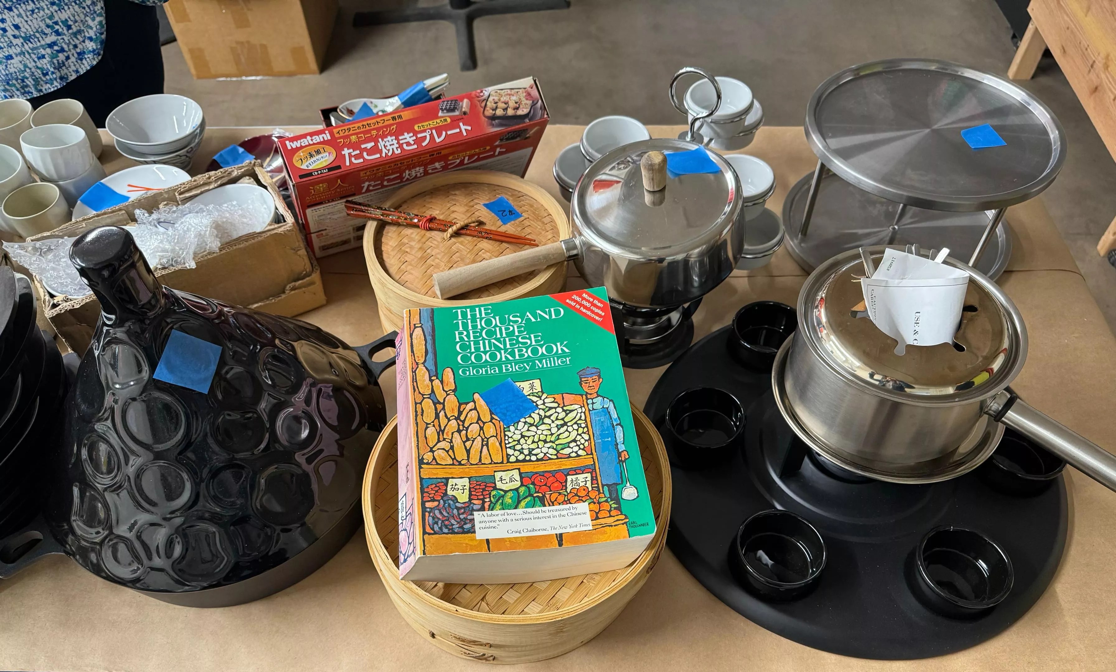 Ripping strips of blue painter’s tape to price a table full of pots and pans, Tracy Dempsey preps for her first culinary rummage sale.