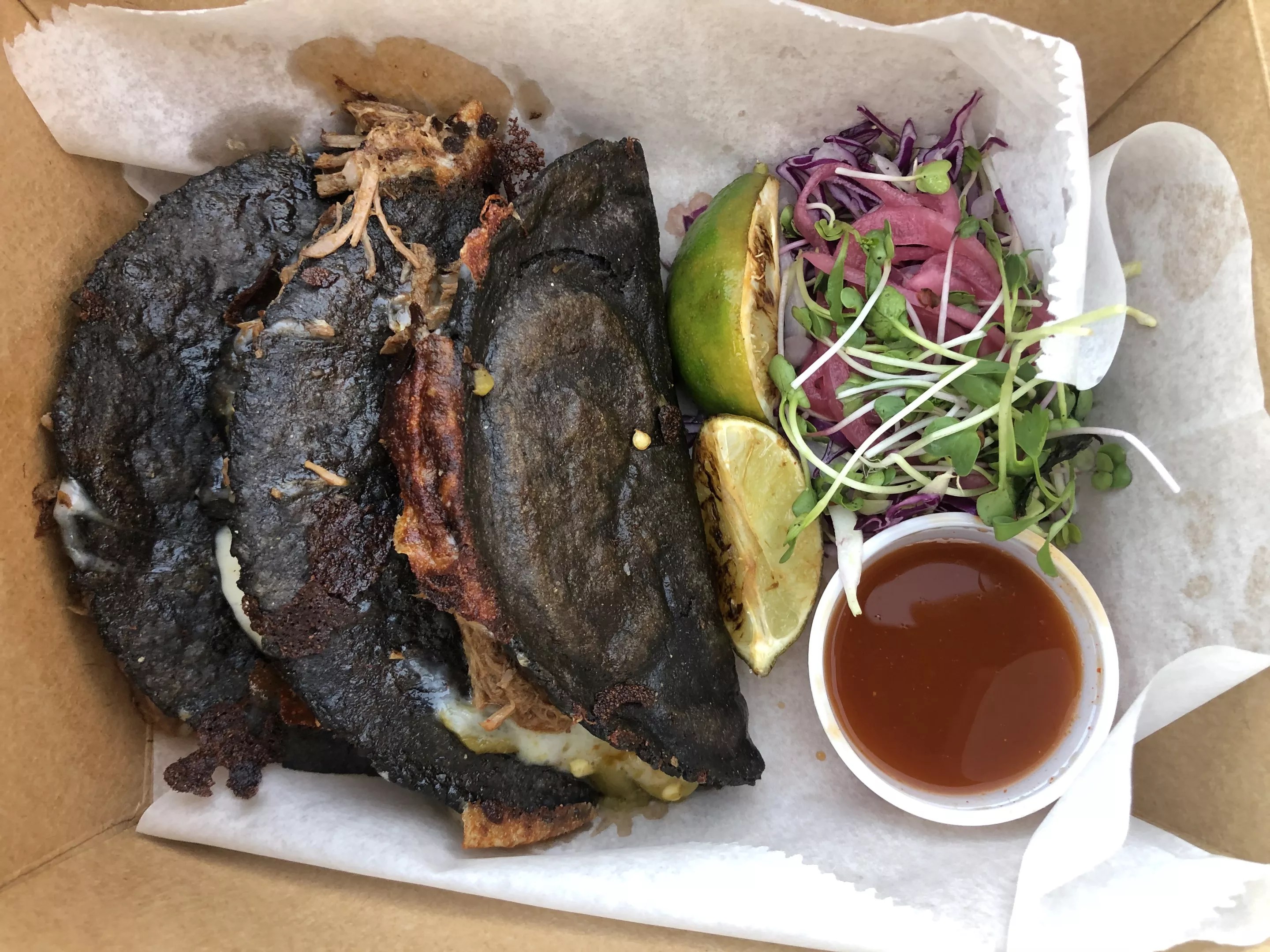 Beyond the short-lived fufu, Smith dished out a birria ramen and a quesabirria taco on a squid ink tortilla. He griddled the tacos a dozen at a time, tossing on newly pressed black tortillas, melting cheese atop stewed beef, and reaching into the thin smoke of the grill to scrape tacos into to-go clamshells filled with slaw, local microgreens, limes, pickled red onions, and a loose salsa that packs modest pepper flavor and good fire.