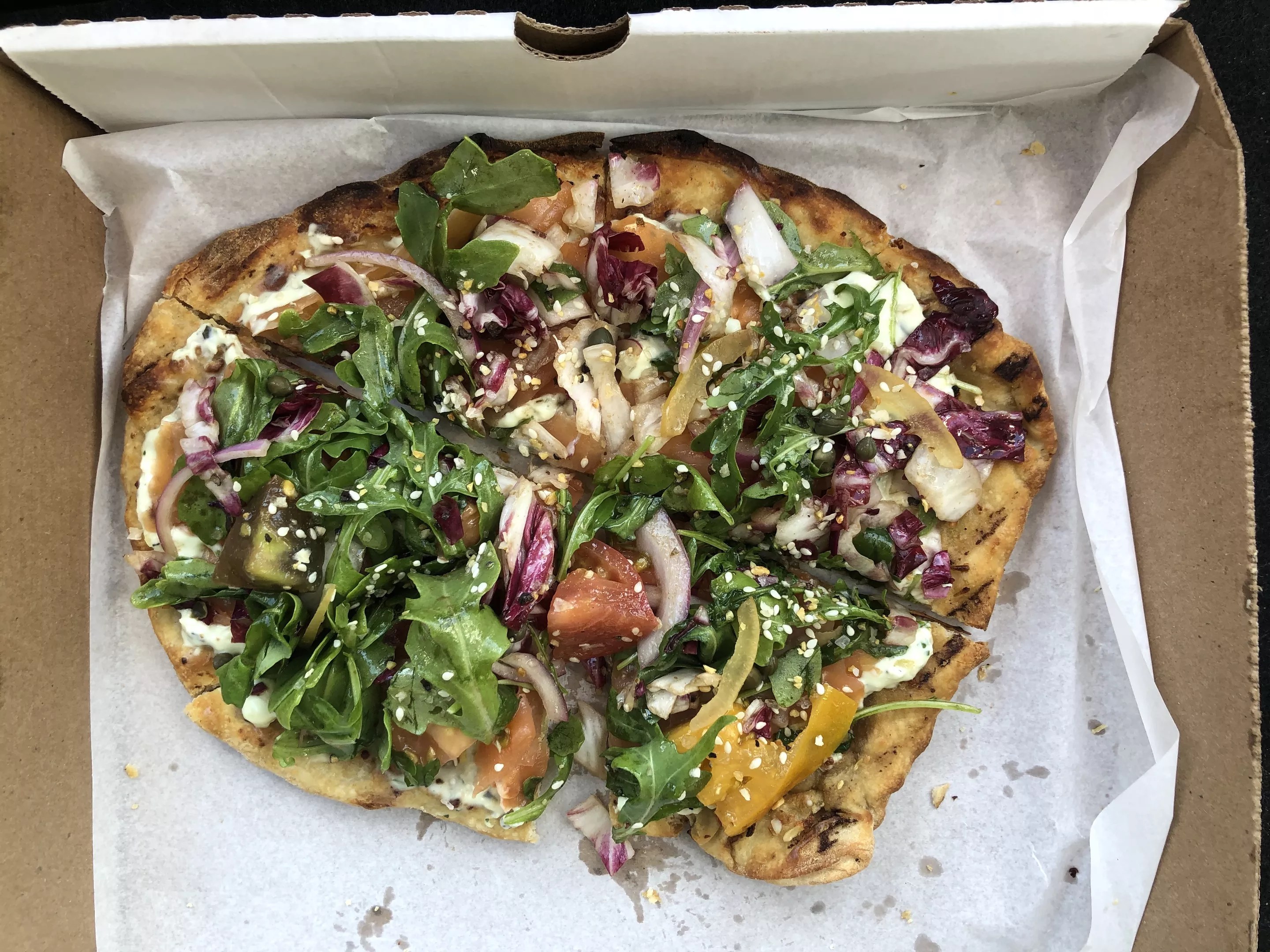 He swaddles the bacon, which is wrapped like Texas brisket at the end of its smoking process, to lock in juices. It’s surrounded by tzatziki, lettuce, pickles, and the warm flatbread. Salty, intense with umami, the bacon has the richness a gyro needs, one that all the other elements work to mellow. It’s a nice, hearty sandwich. (If you order to-go, get tzatziki on the side so the bread doesn’t sog in transit.)